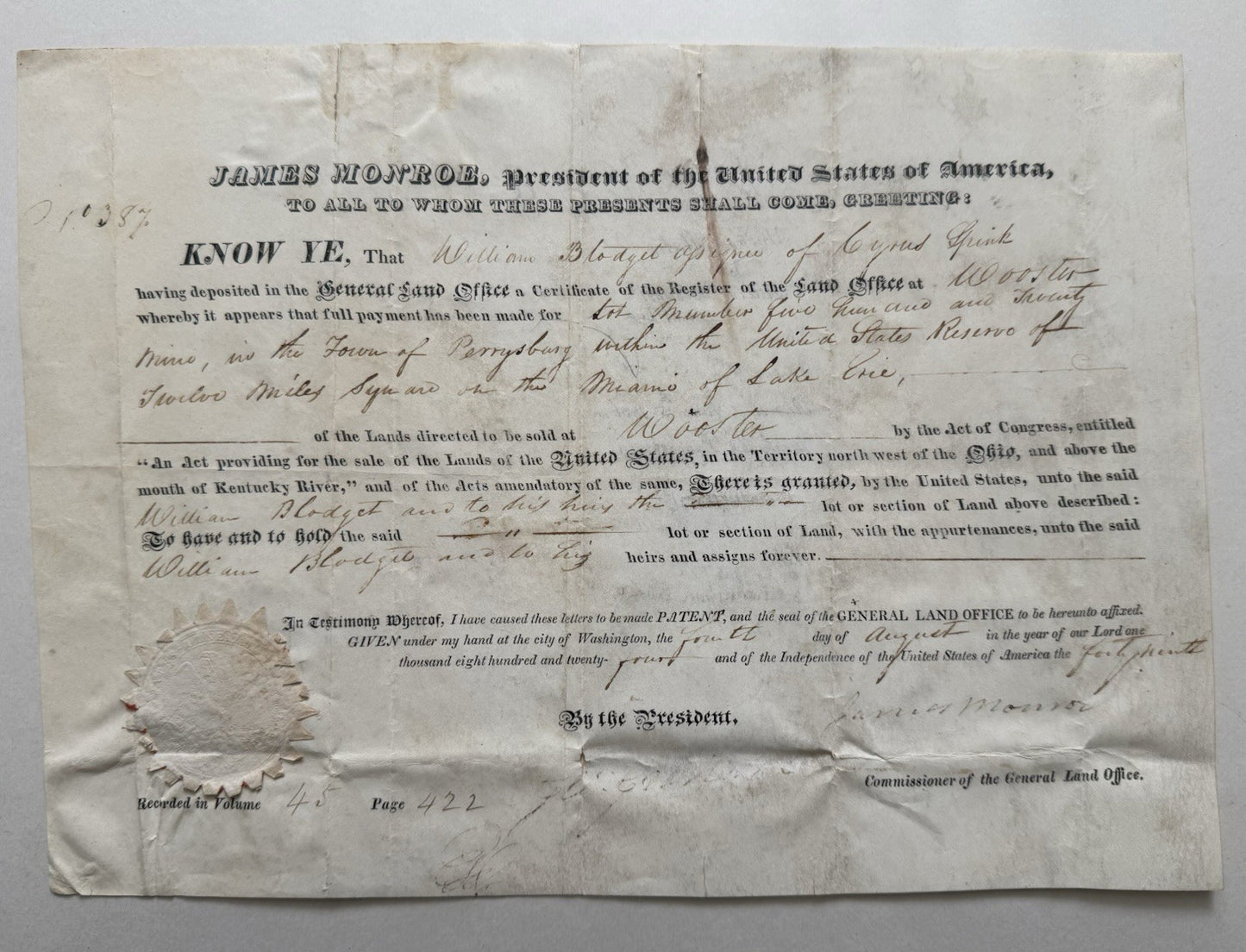 1824 Land Grant Signed By President Monroe