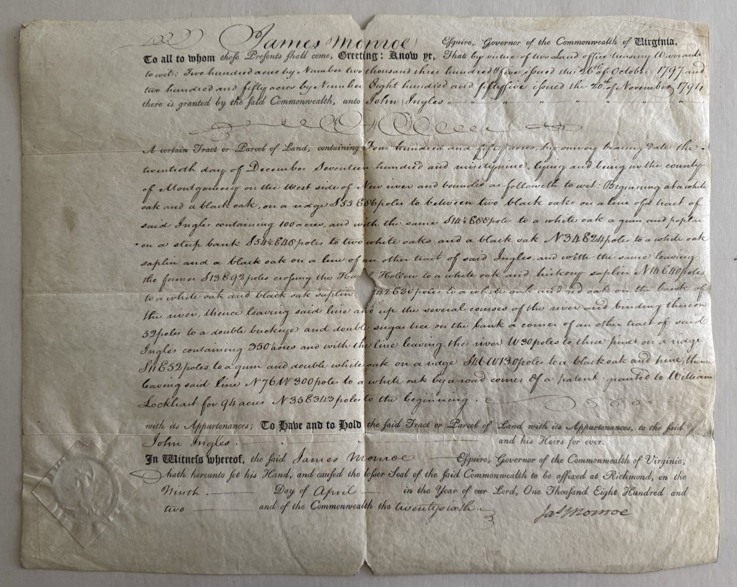 1802 Virginia Land Grant Signed By James Monroe