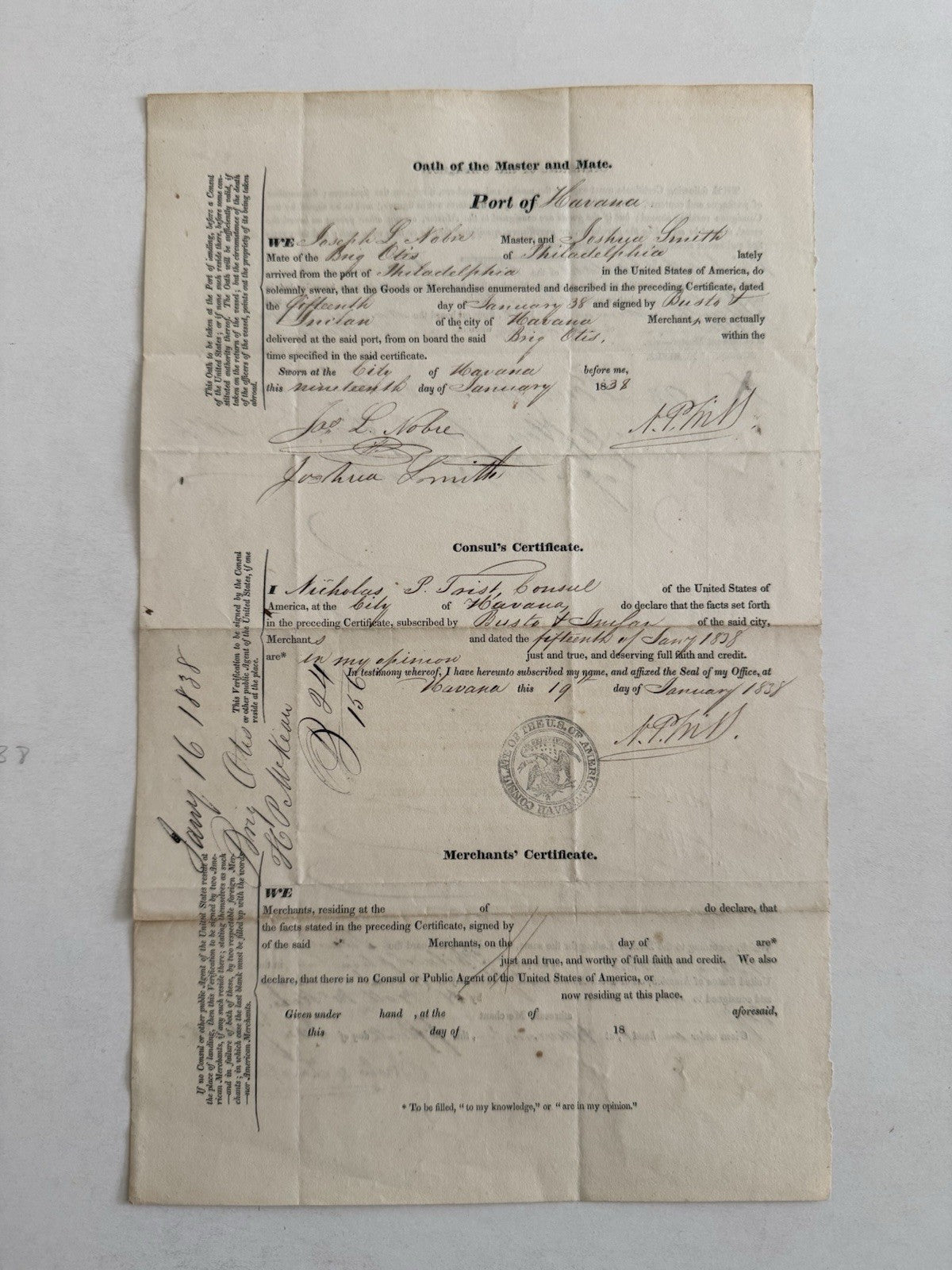 1838 Phila. To Havana Shipping Document Involving Controversial Nicholas Trist