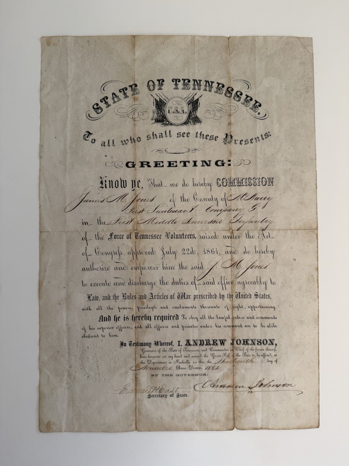 1862 Tennessee Civil War Document Signed By Andrew Johnson
