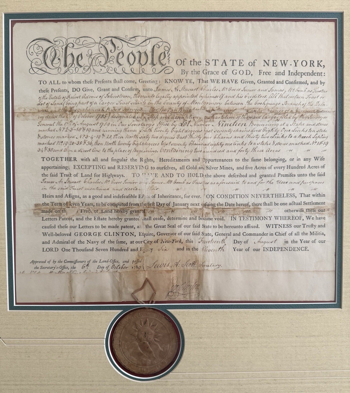 1786 Land Patent Signed By Governor Clinton.
