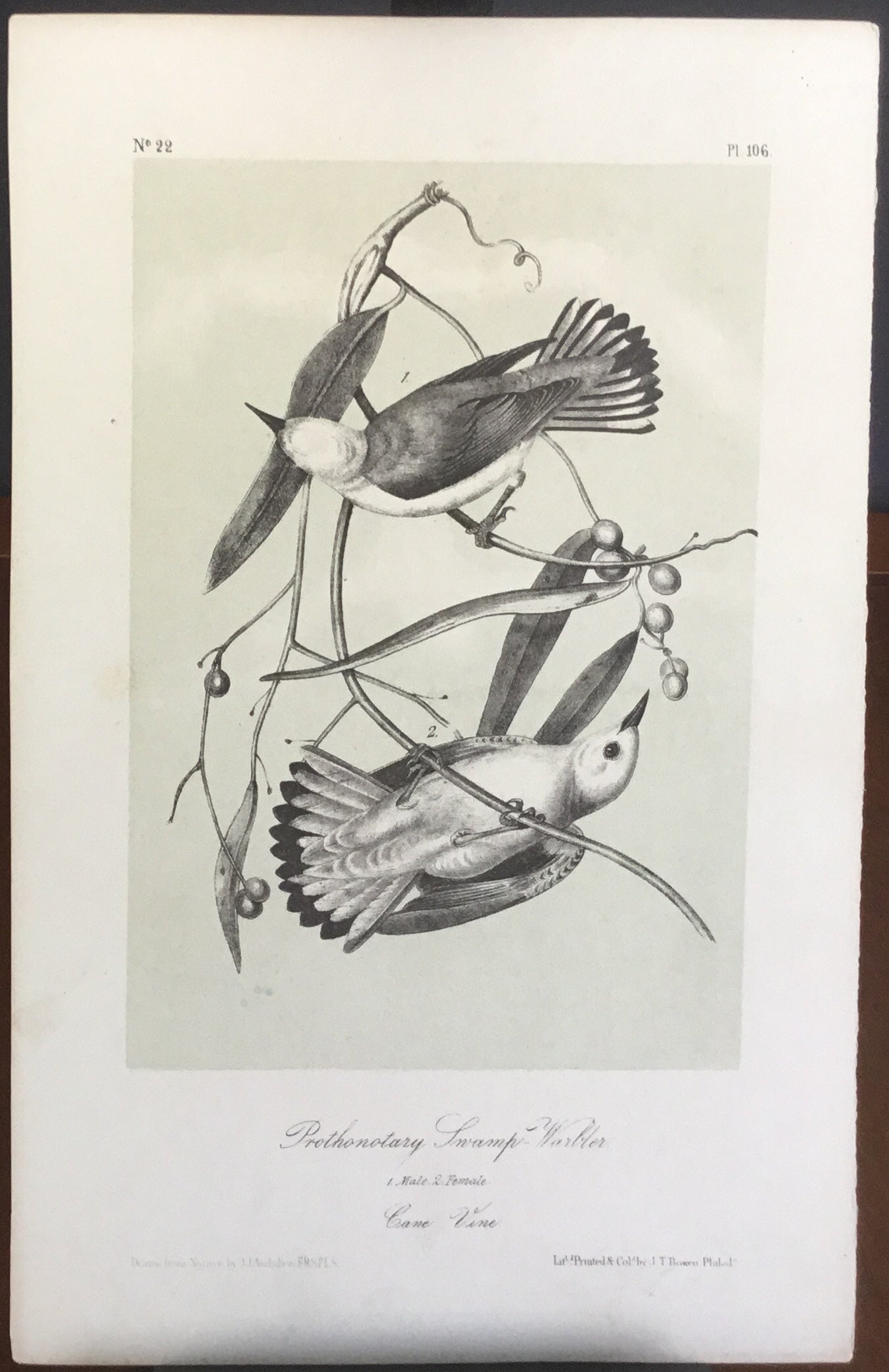 Audubon Octavo Prothonotary Swamp Warbler, plate 106, uncolored test sheet, darker tint, 7 x 11