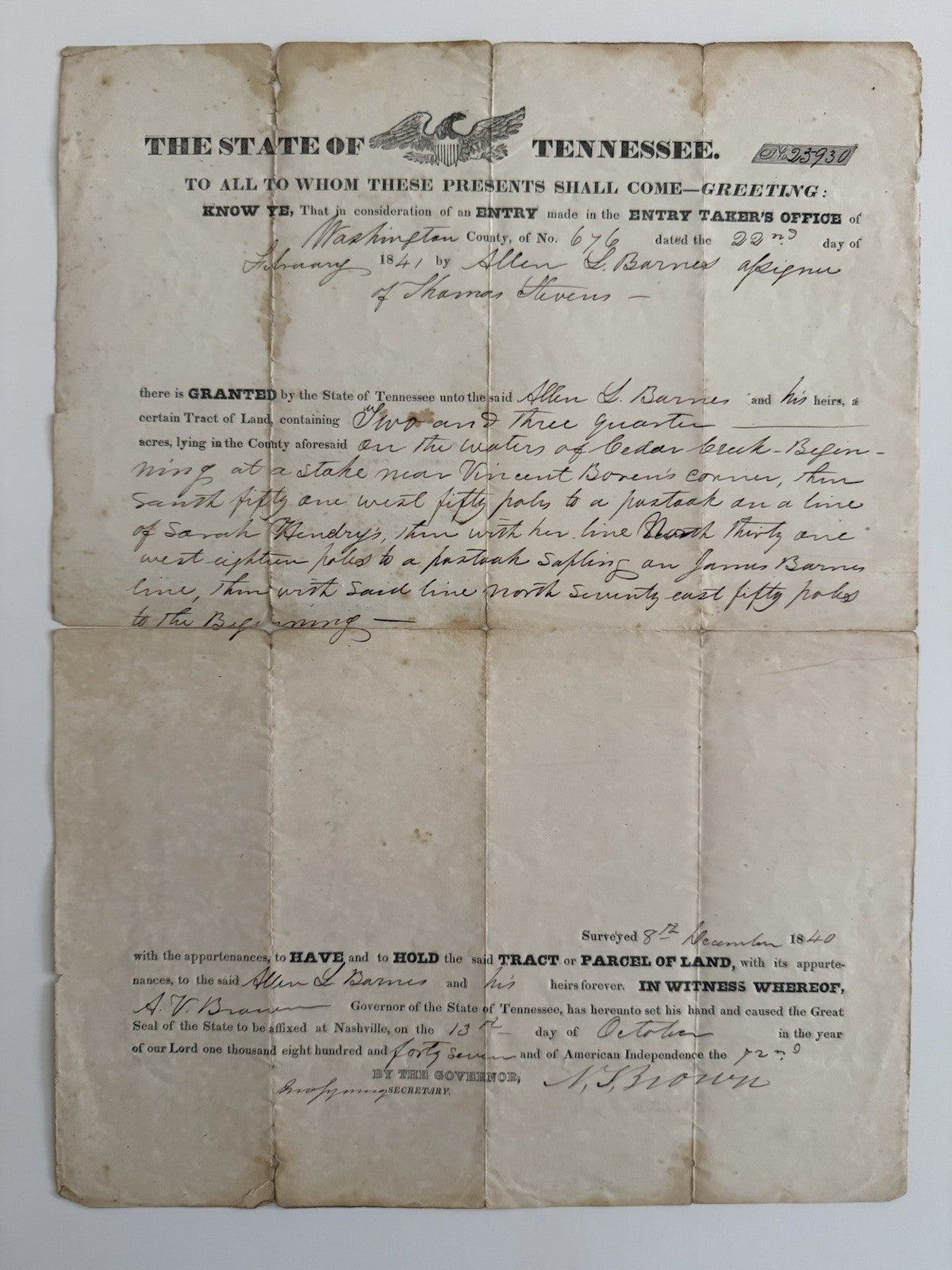 Tennessee Land Grant 1840 Signed By Governor Brown