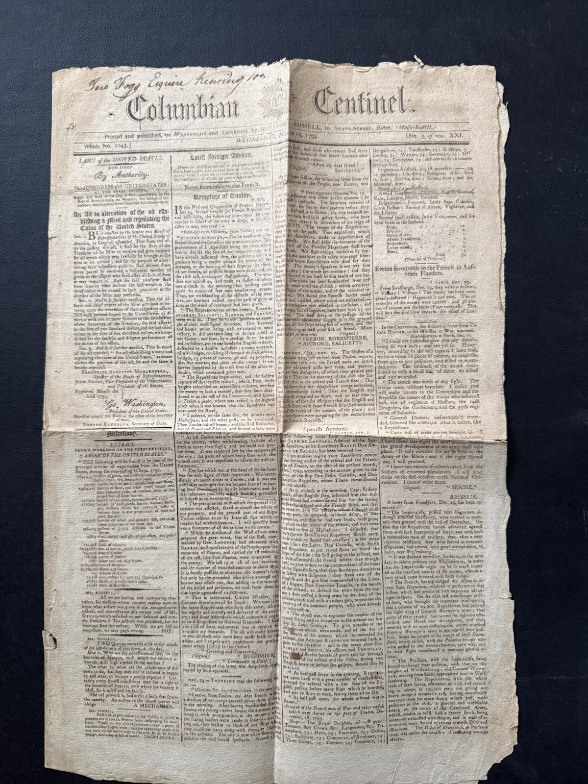 Columbian Centinel Newspaper, March 19, 1794