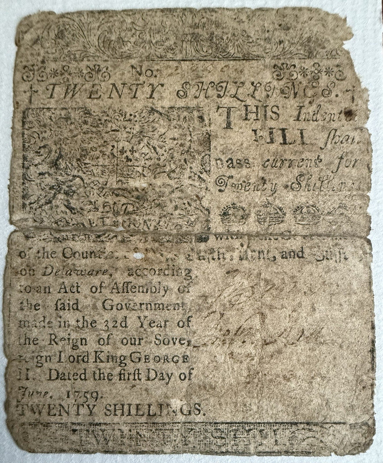Colonial Currency June 1759 20 Shillings Ben Franklin Printer