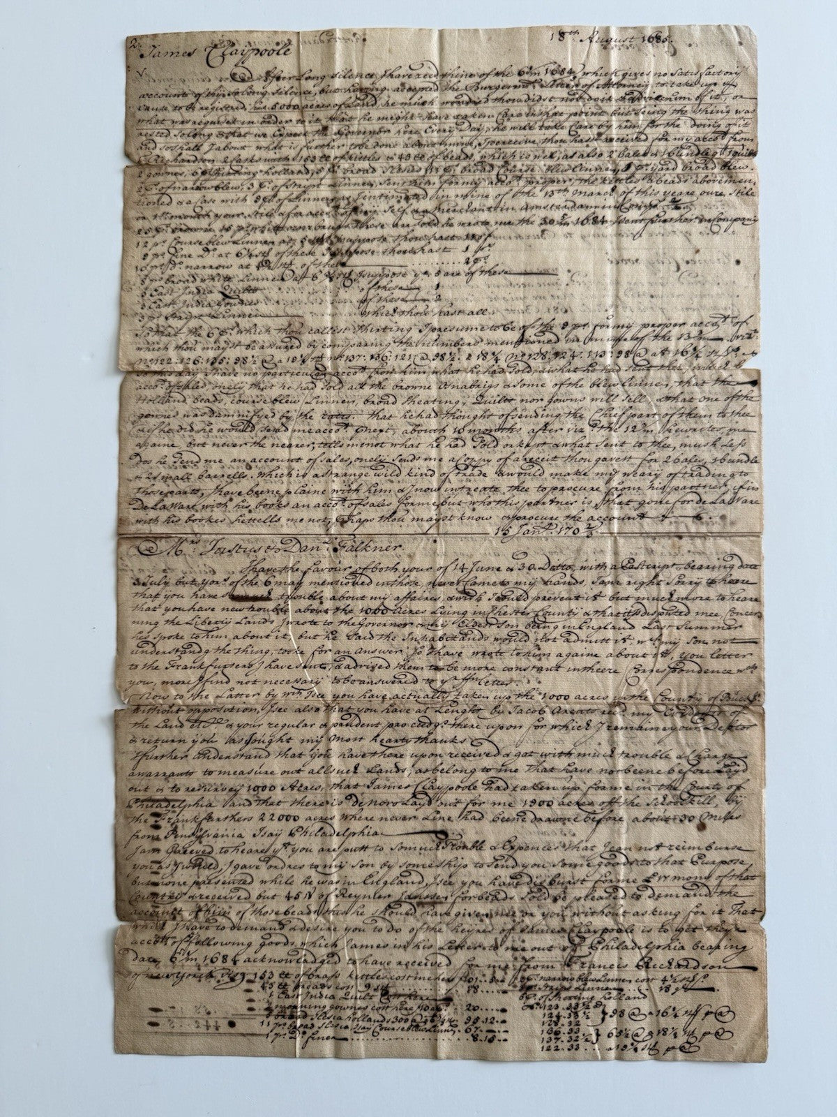 Colonial Era Manuscript Relating To William Penn, James Claypoole And Others