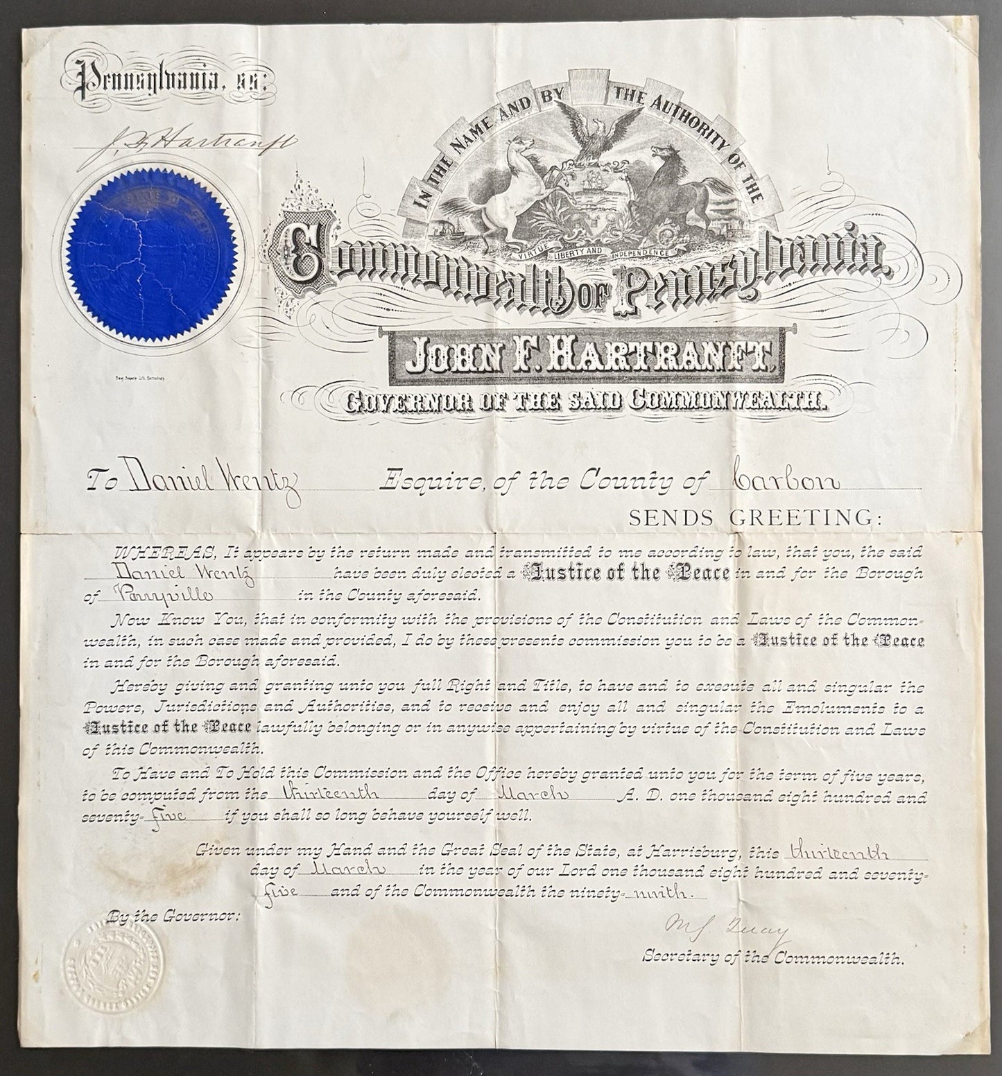 Elegant 1875 Pennsylvania Commission Signed By Governor