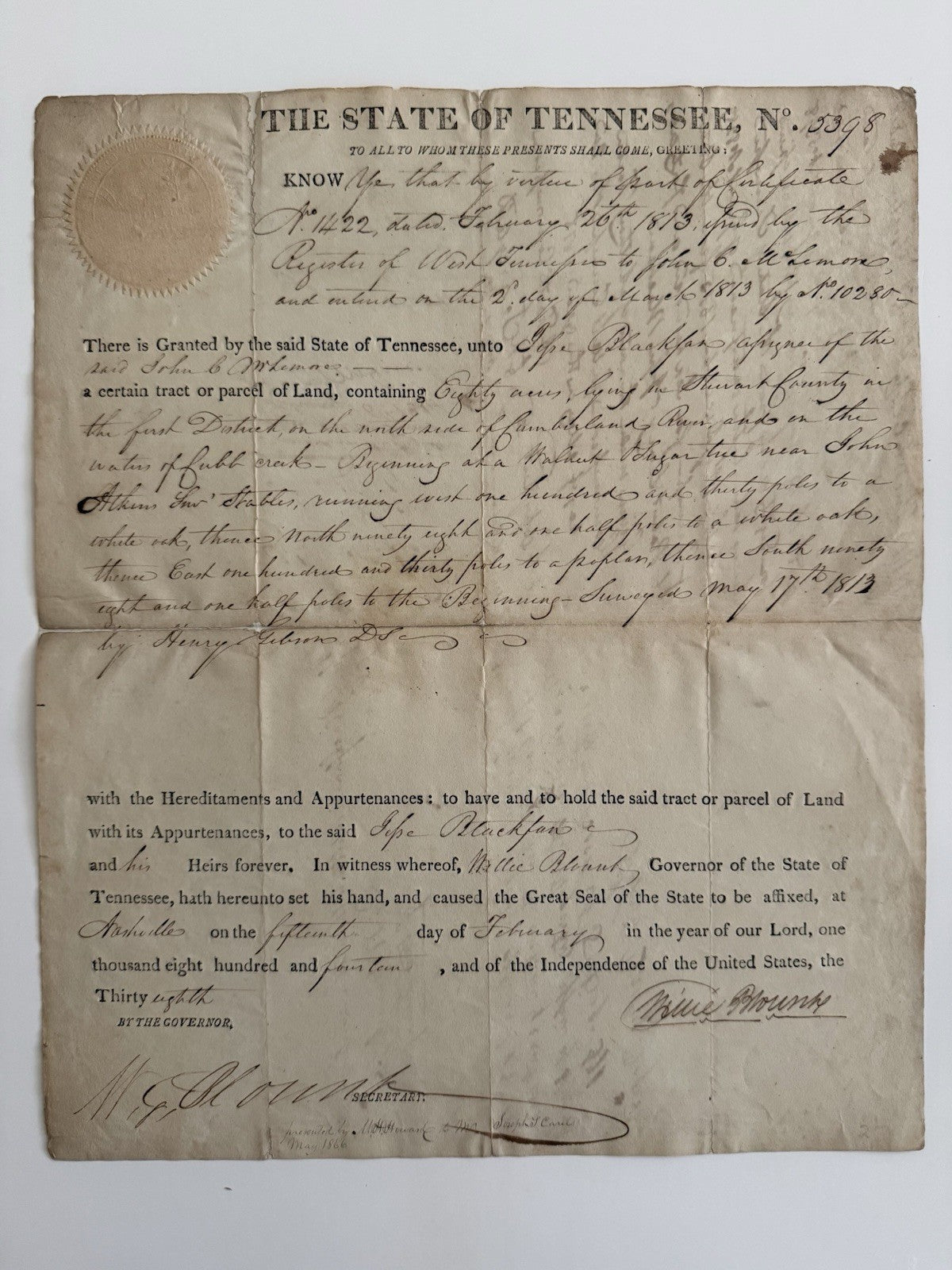 Tennessee Land Grant Signed By Governor Blount, 1814