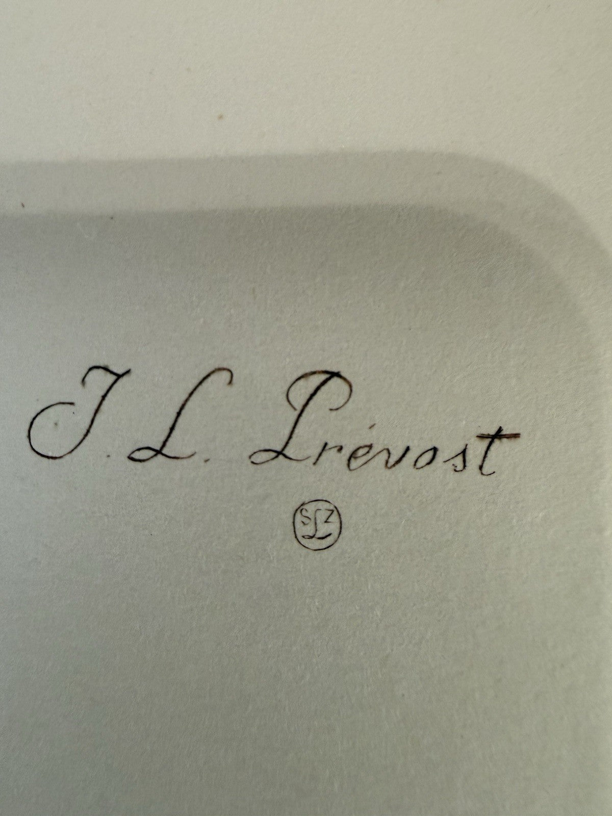 The signature and circular mark belong to Jean-Louis Prévost, a renowned 19th-century French still-life painter and botanist artist. His precise depictions of flowers were often reproduced as color prints for botanical books.