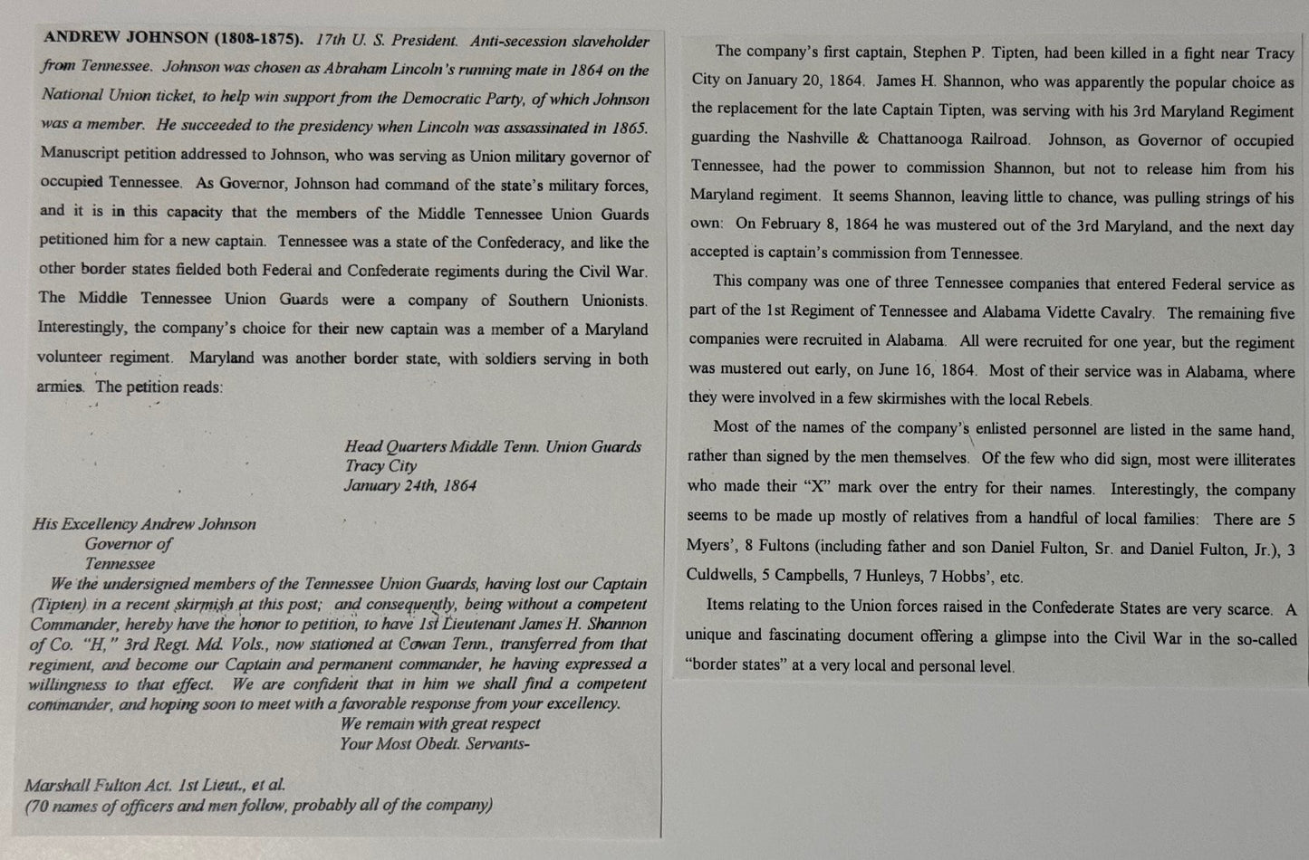 Fascinating letter to future president, then Tennessee Governor, ANDREW JOHNSON (1808-1875), from a Tennessee Unionist company. Manuscript petition addressed to Johnson, who was serving as military governor of occupied Tennessee. As governor, Johnson had command of the state's military forces, and it is in this capacity that the members of the Middle Tennessee Union Guards petitioned him for a new captain. Tennessee was a state of the Confederacy, and like the other border states fielded both Federal and Confederate regiments during the Civil War. The Middle Tennessee Union Guards were a company of Southern Unionists. Their captain having been lost in action, they petitioned Johnson for a new one, by name, Interestingly, their choice for their new captain was a member of a Maryland volunteer regiment, another border state with both Union and Rebel regiments in the field. The company's first captain, Stephen P. Tipten, had been killed in a fight near Tracy City on January 20, 1864. James H. Shannon, the popular choice to replace him, was serving with his 3rd Maryland Volunteer Regiment guarding the Nashville & Chattanooga Railroad. Johnson had the power to commission Shannon, but not to release him from his Maryland service. It seems Shannon, leaving little to chance, was doing some lobbying of his own - on February 8, 1864, he was mustered out of the 3rd Maryland and the next day accepted his captain's commission from Tennessee. This company was one of three Tennessee companies in Federal service as part of the 1st Regiment of Tennessee and Alabama Vidette Cavalry. Most of the company's enlisted personnel are listed on the petition in the same hand. Of the few who did sign, most were illiterates who made their "X" mark over the entry for their names. Interestingly, the company seemed to be made up mostly of relative from a few local families. There are 5 Myers', 8 Fultons (inlcuding father and son Daniel Fulton Sr. and Jr.), 3 Culdwells, 5 Cambells, 7 Hunleys, and 7 Hobbs'. Items relating to the Unionj forces raised in the Confederate States are extremely scarce. A unique and fascinating document offering a glimpse into the Civil War in the border states at a very personal and local level. Share some information about your product