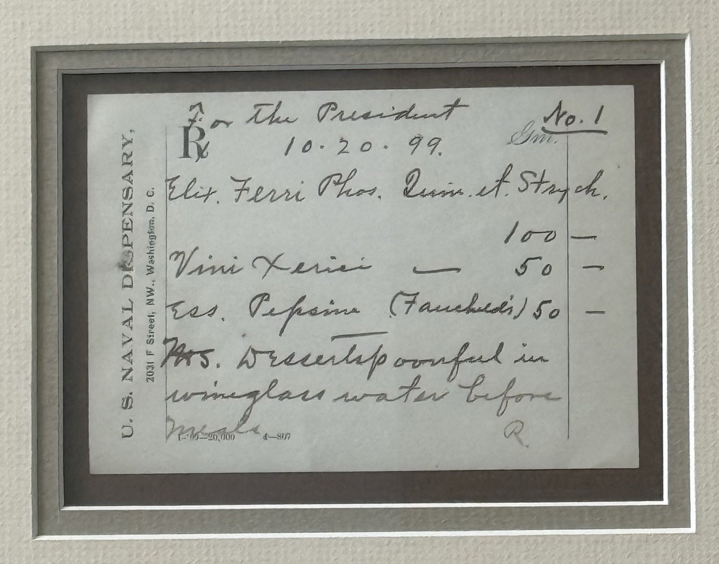 Medical prescription labels for the President and Mrs. McKinley, 1899 and 1900 from the U.S. Naval Dispensary in Washington D.C., written by the McKinleys personal physician Doctor Rixey.