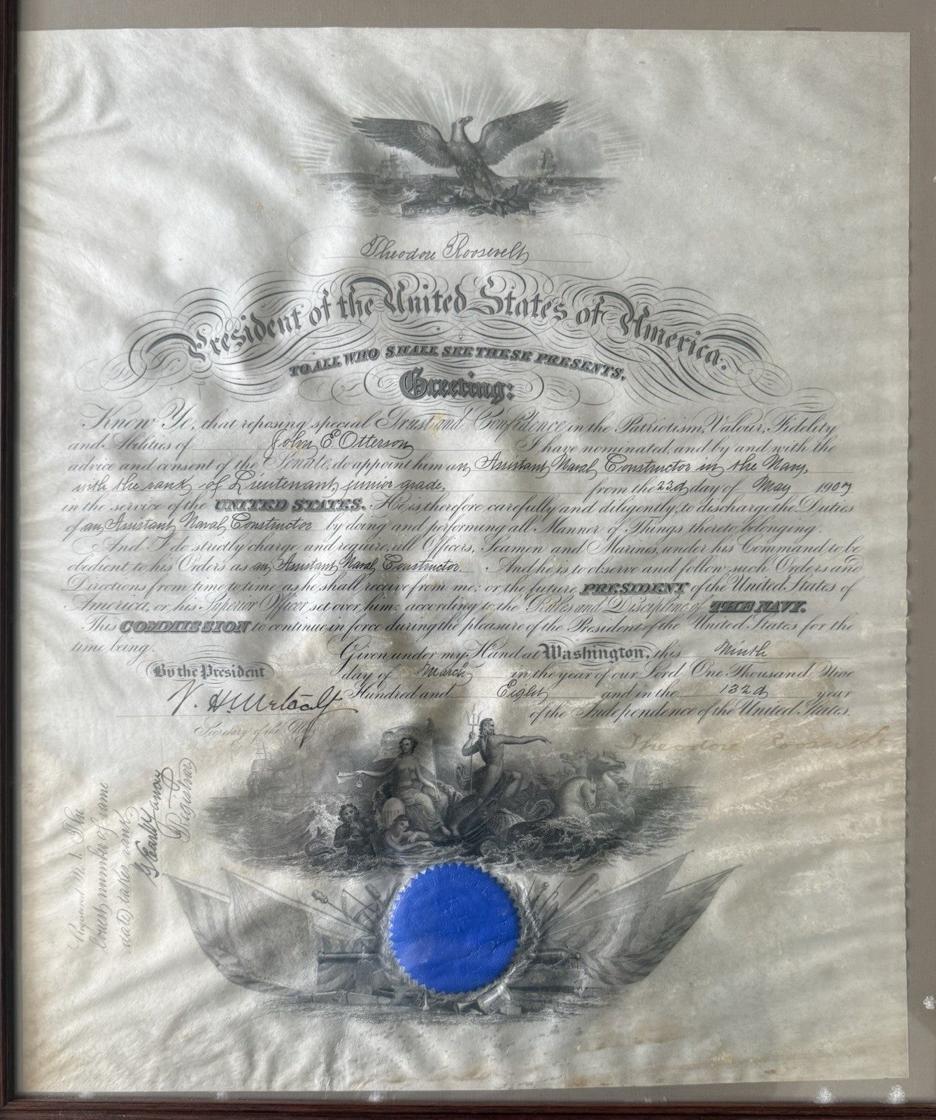 This is a signed U.S. naval commission document from President Theodore Roosevelt, dated March 4, 1907. This historical artifact appoints a man to the position of Assistant Naval Constructor in the U.S. Navy.