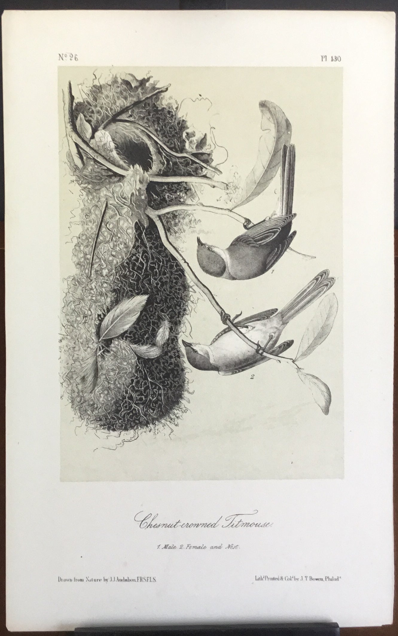 Audubon Octavo Chestnut-crowned Titmouse, plate 130, uncolored test sheet, 7 x 11