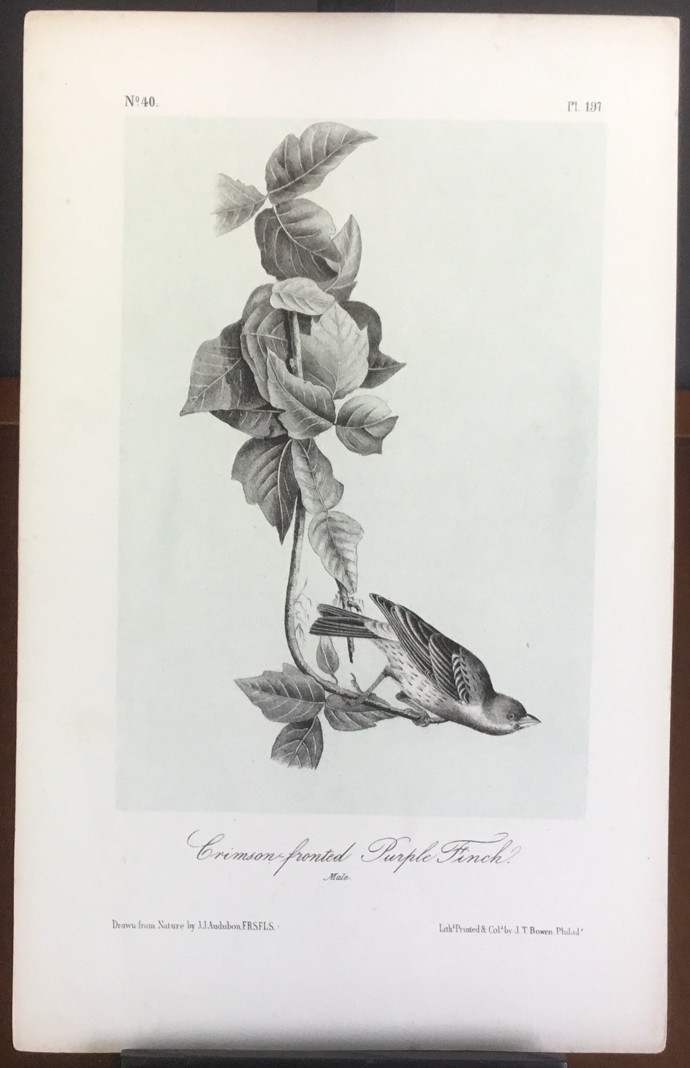 Audubon Octavo Crimson-fronted Purple Finch (2), plate 197, uncolored test sheet, 7 x 11