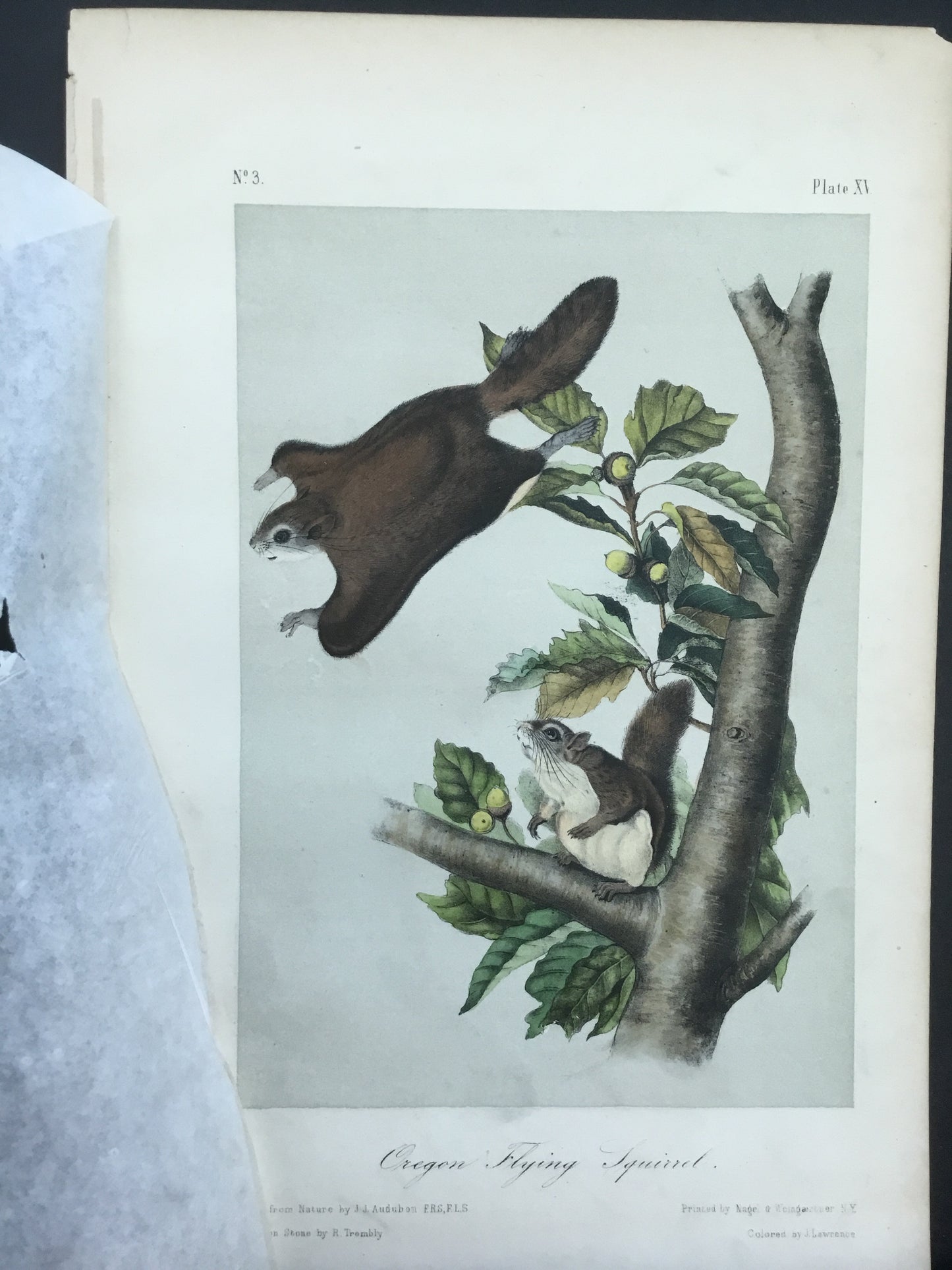 Audubon Original Octavo Quadruped 15, Oregon Flying Squirrel measures 6 1/2 x 10 inches. Very good condition. 1/8 inch chipped from upper right corner. Tissue paper attached.