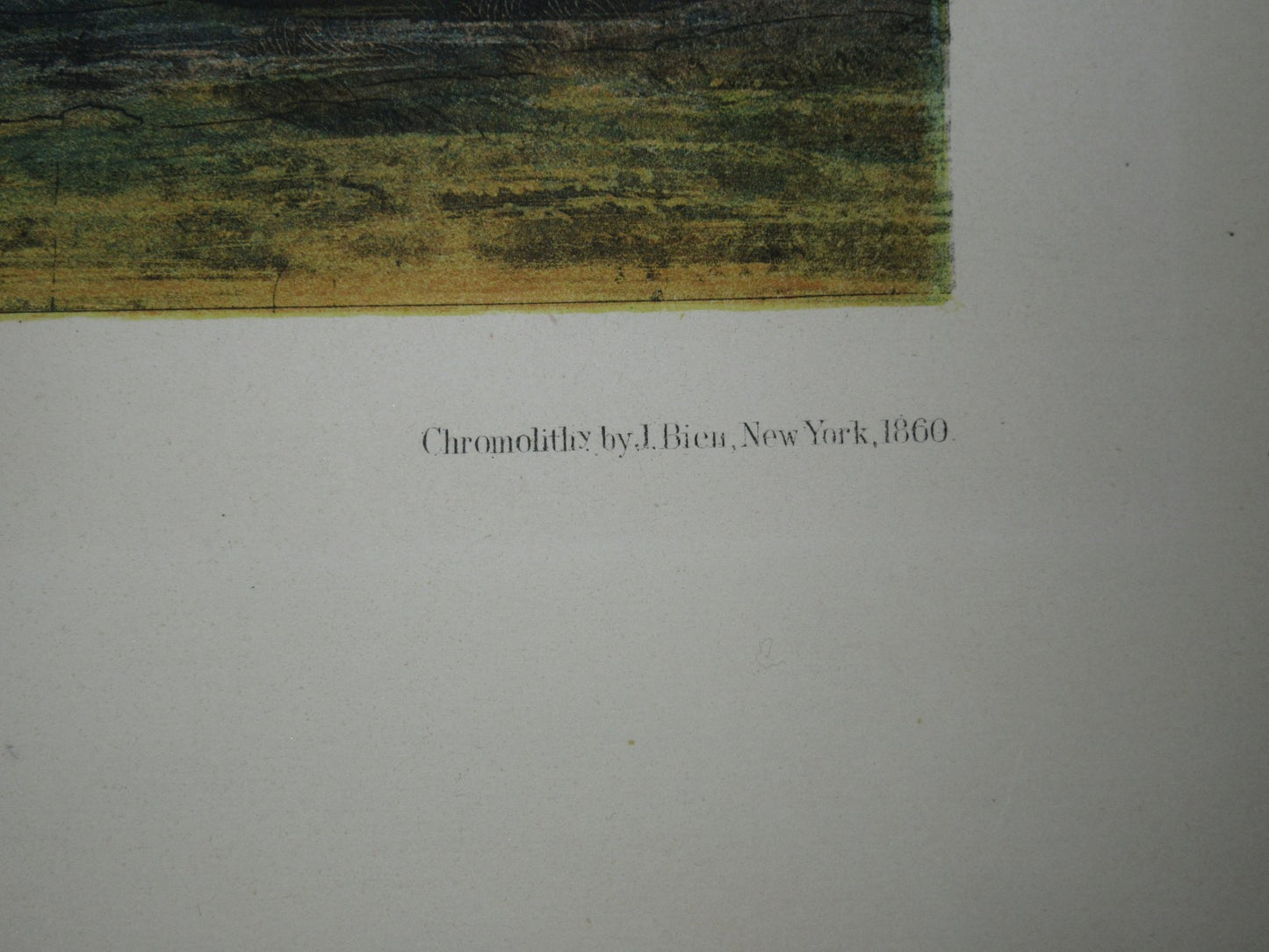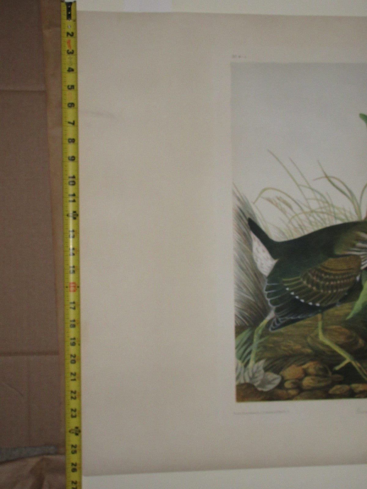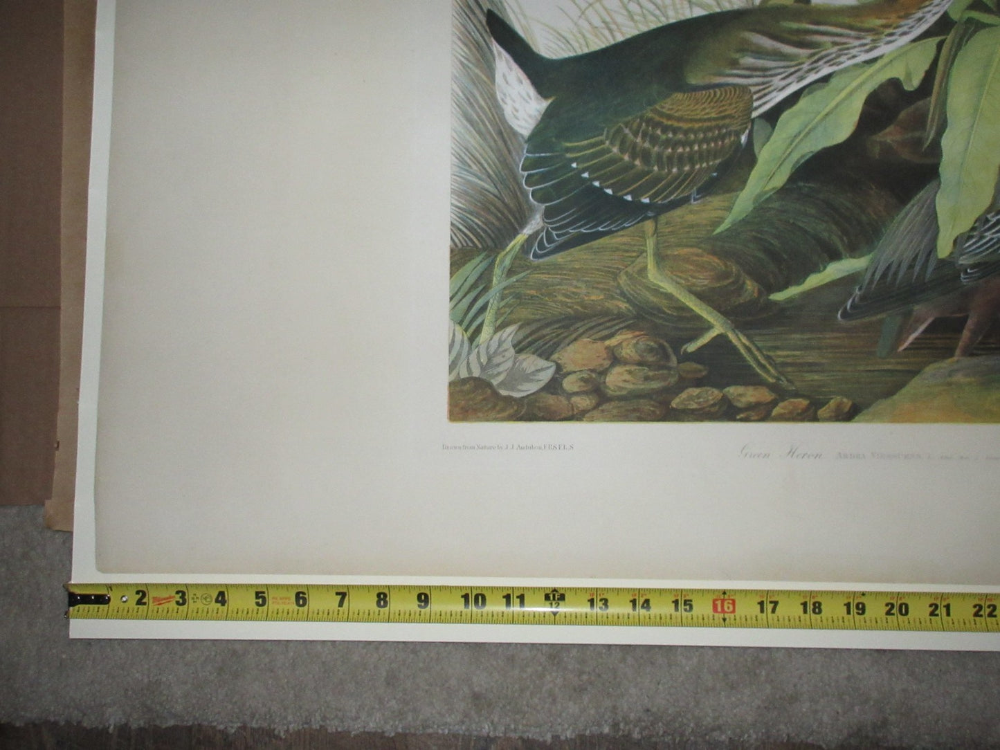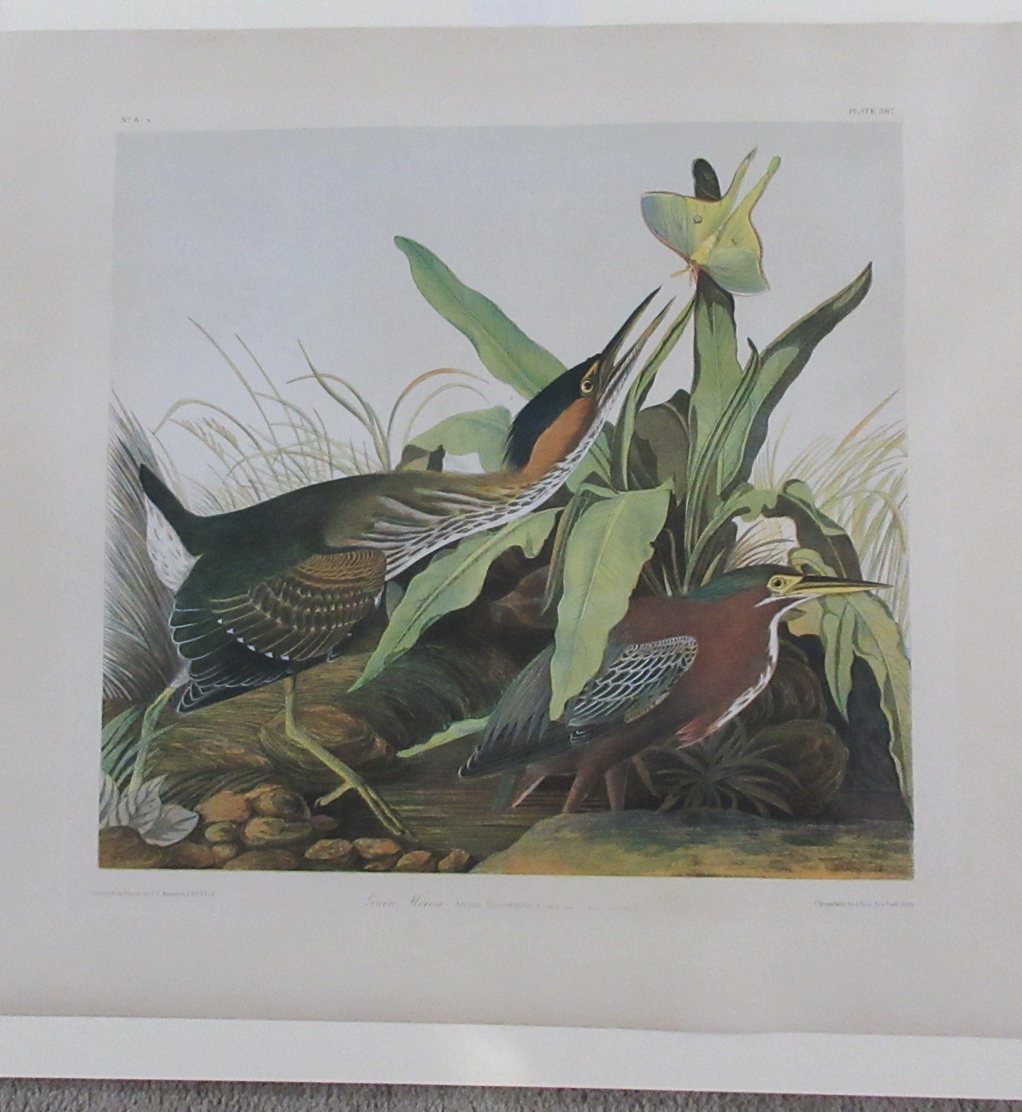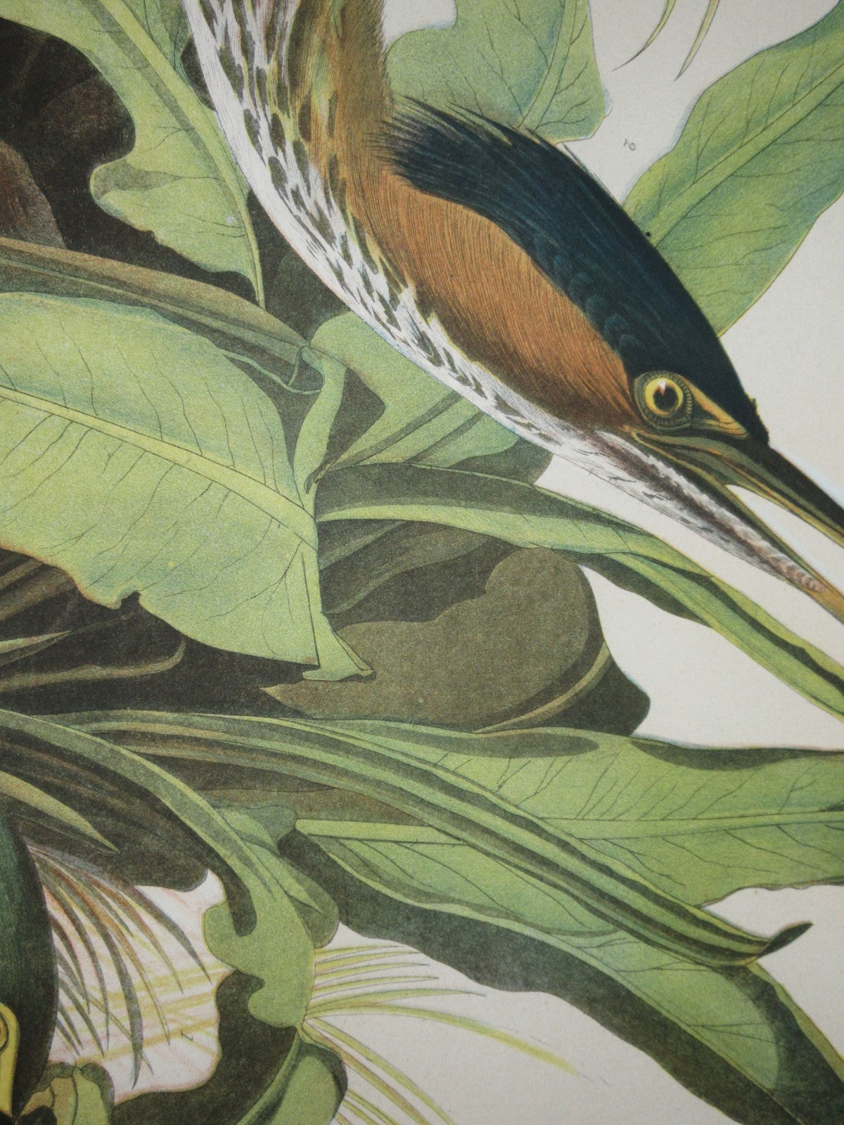 Excellent condition as shown. 26 x 38 inches. The rarest of all Audubon editions. Chromolithograph by J. Bien. The Bien edition prints of the Birds of America were produced by the Audubon family, and thus are properly termed originals. Unlike the Havell edition prints which were produced in England, the Bien Edition prints were produced completely in America. Thus, they are truly American originals. In 1858, about seven years after John James Audubon passed away, his younger son John Woodhouse Audubon initiated an ambitious project to reissue the Birds of America to solve some of the mounting financial problems. He recruited the Roe Lockwood Company in New York city to publish the works and Julius Bien for lithography. Unlike the Havells which were produced from copper engraving plates, Julius Bien utilized the newly emerging chromolithography process as a way of reducing the costs of production. Chromolithography utilized different sets of printing stones to produce a given plate, some with different colors to produce the final colored image. The use of different stones occasionally resulted in very slight misregister of colors on the dark outlines of birds and background, thus serving as a charming reminder of chromolithography process. Larger images were printed on a single page as in the Havell edition, whereas smaller images were printed two per page. All the larger images as well as some smaller images carry the credit "Chromolithy by J. Bien, New York, 1860". Thus these images are commonly referred to as the Bien edition plates. Unfortunately, the start of the Civil War in 1860 brought an abrupt end to this project (and a financial ruin to the Audubon family) after only about 105 pages were printed. It was said that about 100 copies of each page (with bird images) were produced, but most of them did not survive.