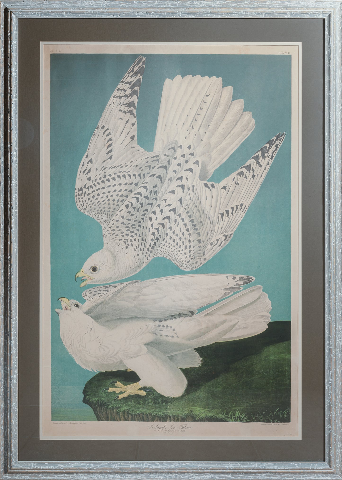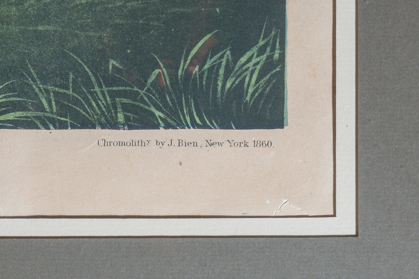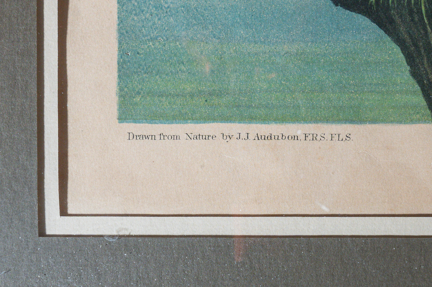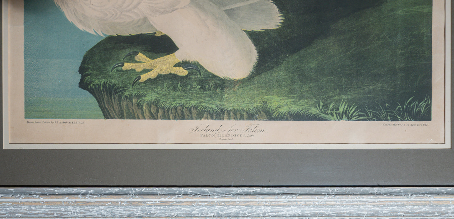 Number 13-2, plate number 19. Original framed chromolithograph dated 1860. This beautiful original is floated in the frame showing all edges. Very good condition. Purchased from The Old Print Shop in New York in 1906. The Bien edition prints of the Birds of America were produced by the Audubon family, and thus are properly termed originals. Unlike the Havell edition prints which were produced in England, the Bien Edition prints were produced completely in America. Thus, they are truly American originals. In 1858, about seven years after John James Audubon passed away, his younger son John Woodhouse Audubon initiated an ambitious project to reissue the Birds of America to solve some of the mounting financial problems. He recruited the Roe Lockwood Company in New York city to publish the works and Julius Bien for lithography. Unlike the Havells which were produced from copper engraving plates, Julius Bien utilized the newly emerging chromolithography process as a way of reducing the costs of production. Chromolithography utilized different sets of printing stones to produce a given plate, some with different colors to produce the final colored image.