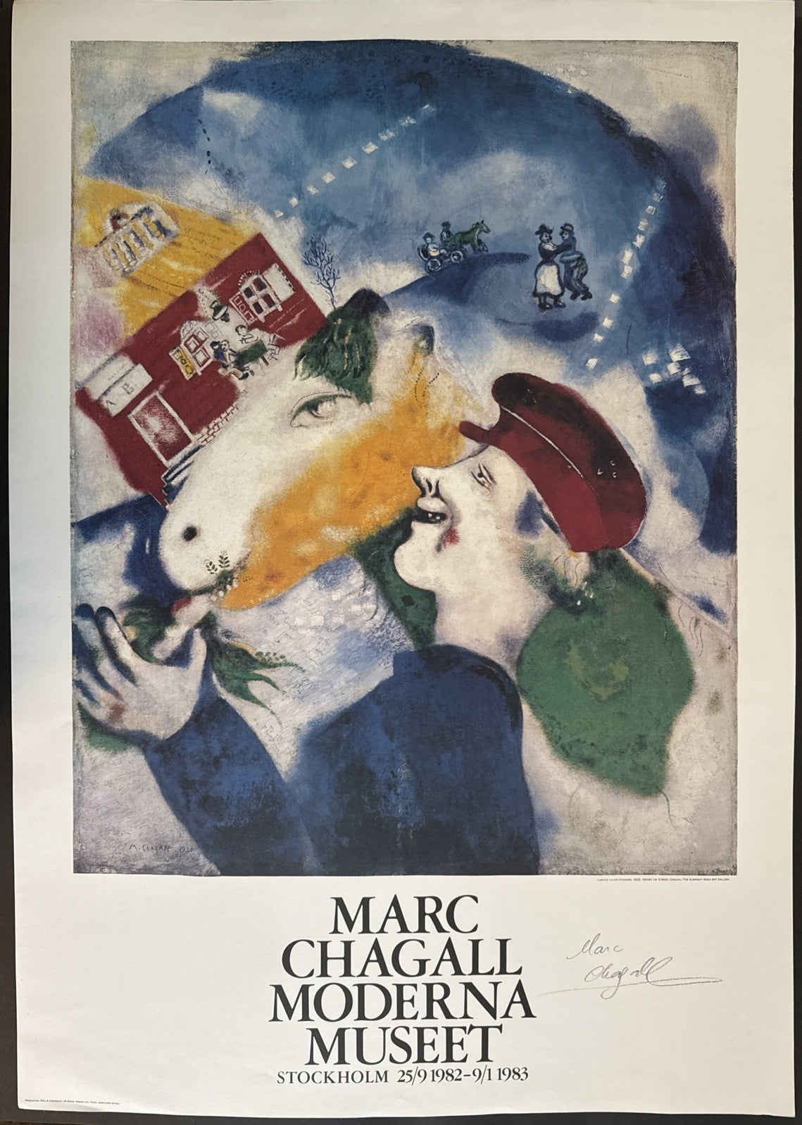 The poster advertises an exhibition of Chagall's work at the Moderna Museet in Stockholm, Sweden, held from September 25, 1982, to January 9, 1983.