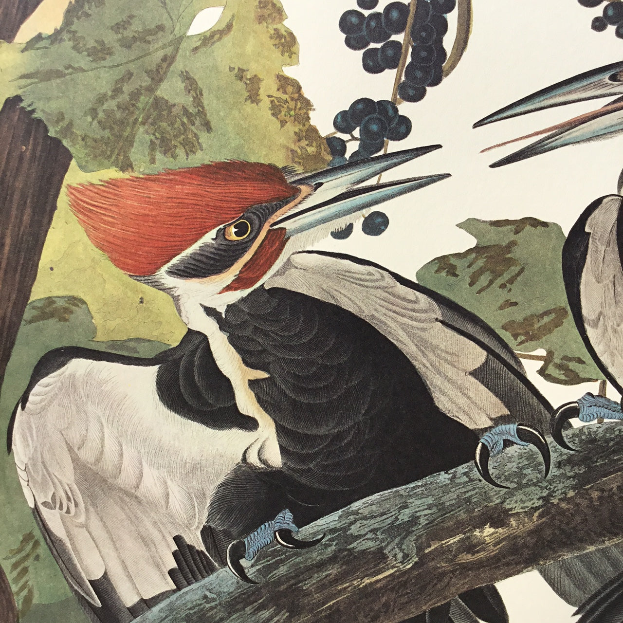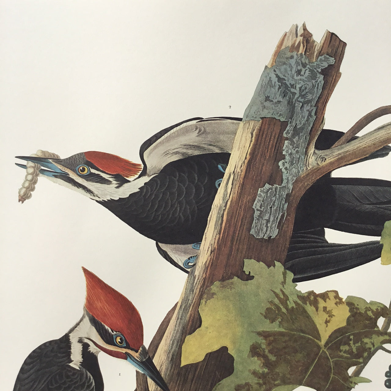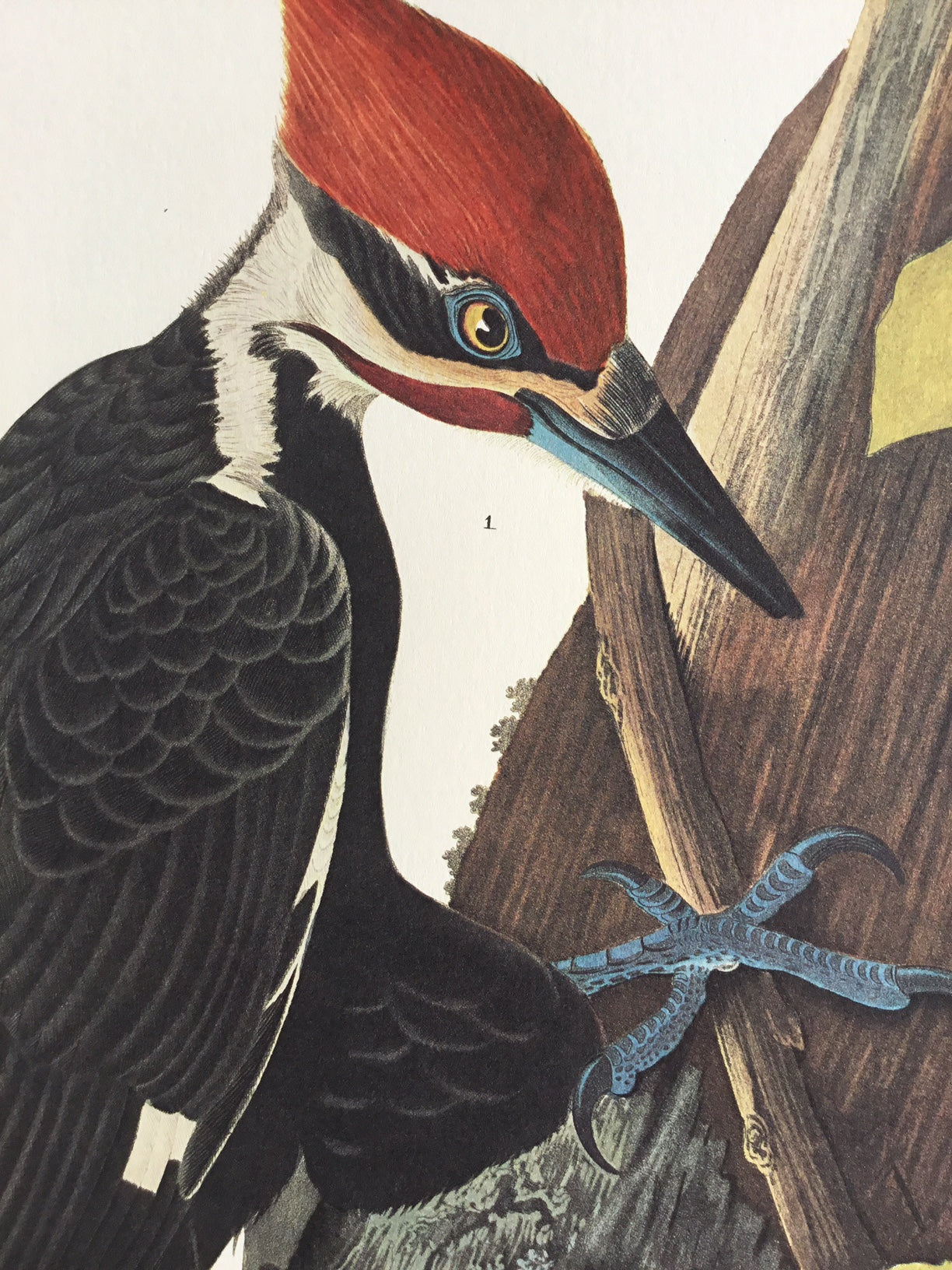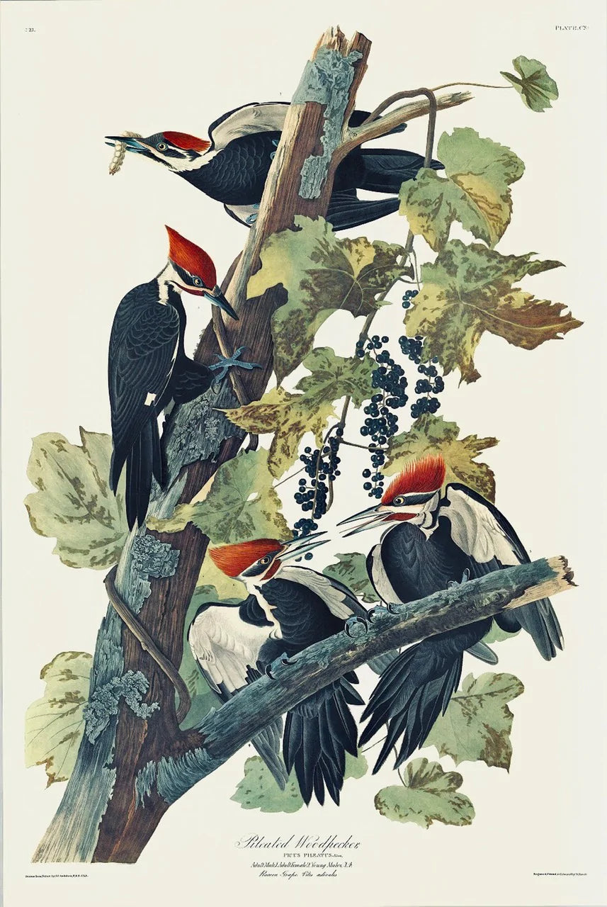 He wrote, “When followed [the pileated woodpecker] always alights on the tallest branches or trunks of trees, removes to the side farthest off, from which it every moment peeps, as it watches you progress in silence.” Audubon also wrote: “The observation of many years has convinced me, that Woodpeckers of all sorts have the bill longer when just fledged than at any future period of their life, and that through use it becomes not only shorter, but also much harder, stronger, and sharper.”