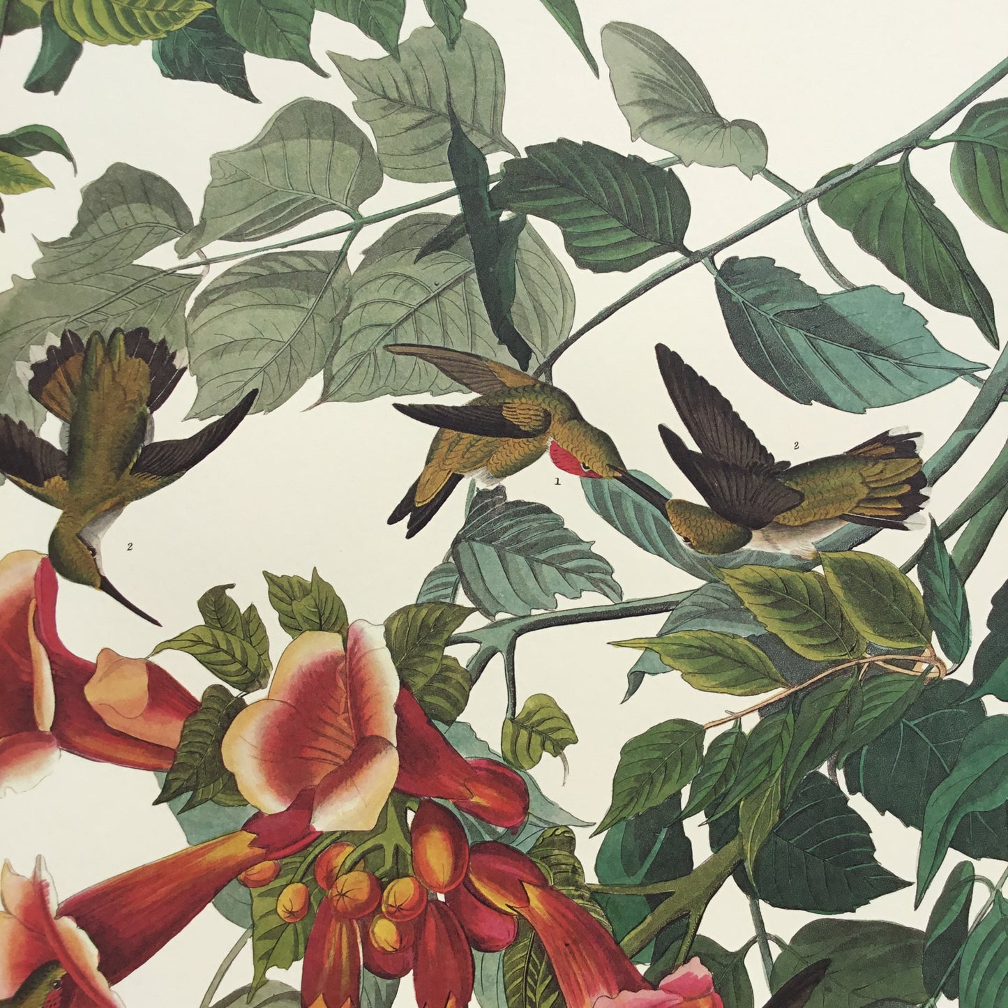 Hummingbirds, found only in the New World, fascinated Americans and Europeans of Audubon's day. To gratify this widespread curiosity with a number of views of the diminutive ruby-throat, he placed ten of them together, although in nature they are too pugnacious to associate this closely.