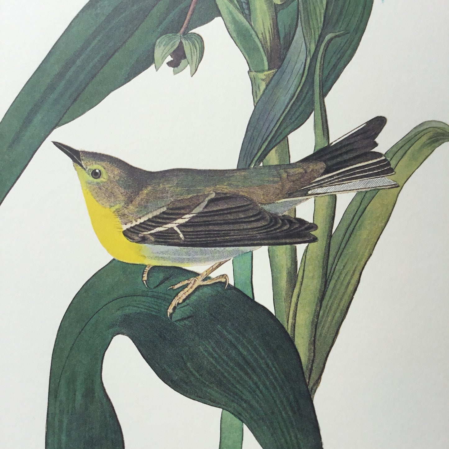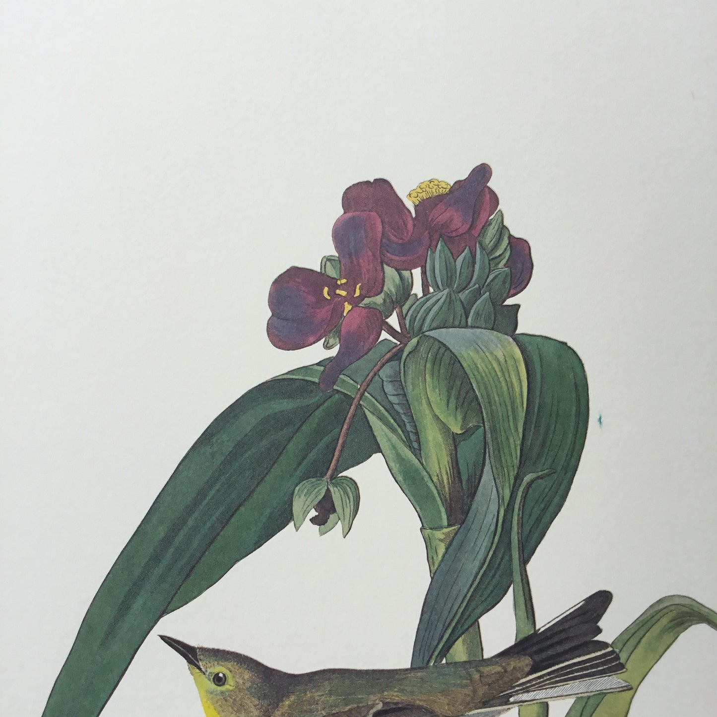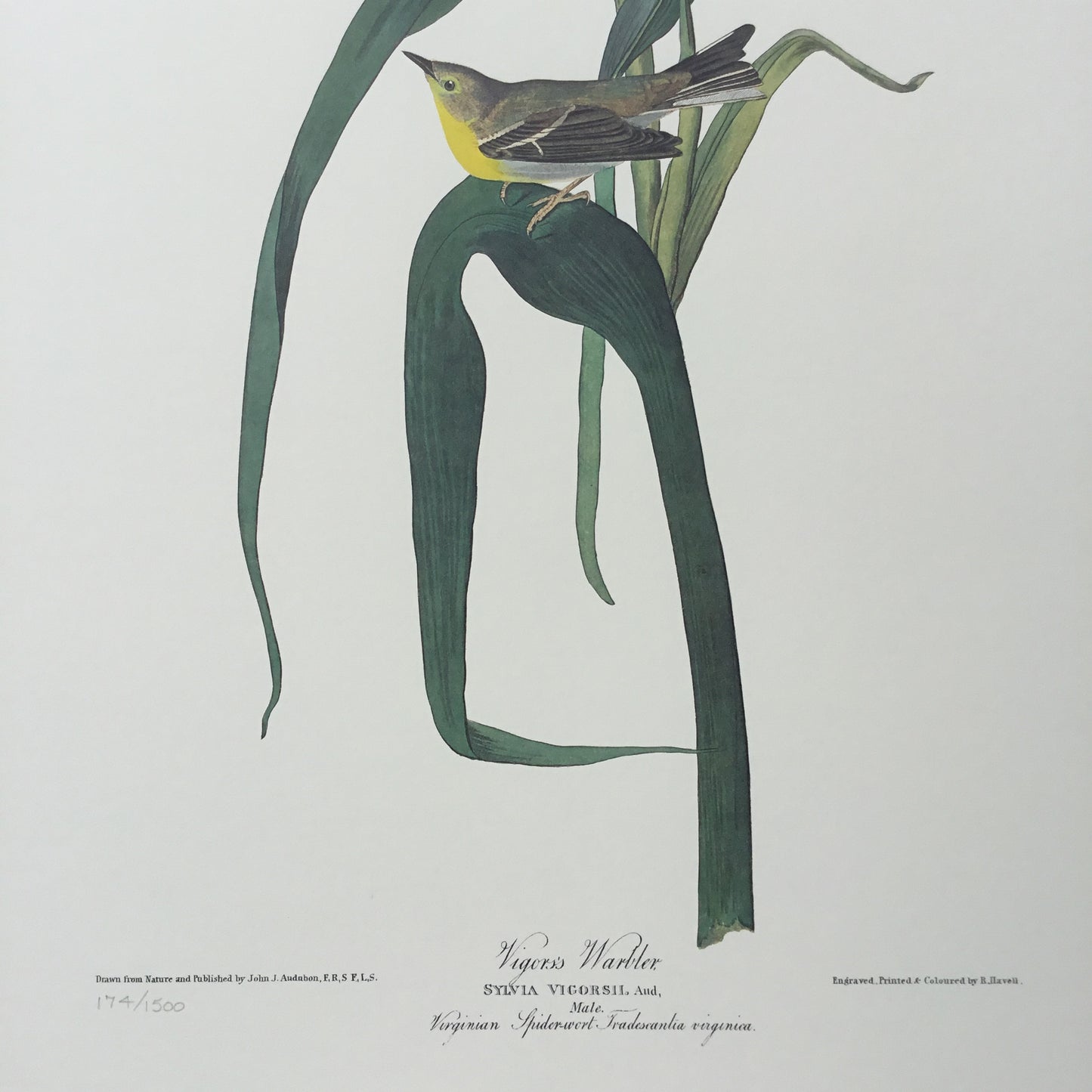With a name difficult to enunciate and impossible to locate in a bird guide, Vigors's warbler is in truth an immature pine warbler. Considering that the bird has also been known as a pine-creeping warbler or a pine creeper because of its preference for evergreen habitat, this portrait seems executed on an unlikely perch-a spiderwort plant. But that is exactly where Audubon saw it one day in May 1812 during a visit to Mill Grove, the farm he once owned on Perkiomen Creek, near Valley Forge, Pennsylvania. Later, thinking it to be an undiscovered species, he named it "Vigors's Warbler" in honor or the English naturalist Nicholas A. Vigors, whom he met in London in 1828.