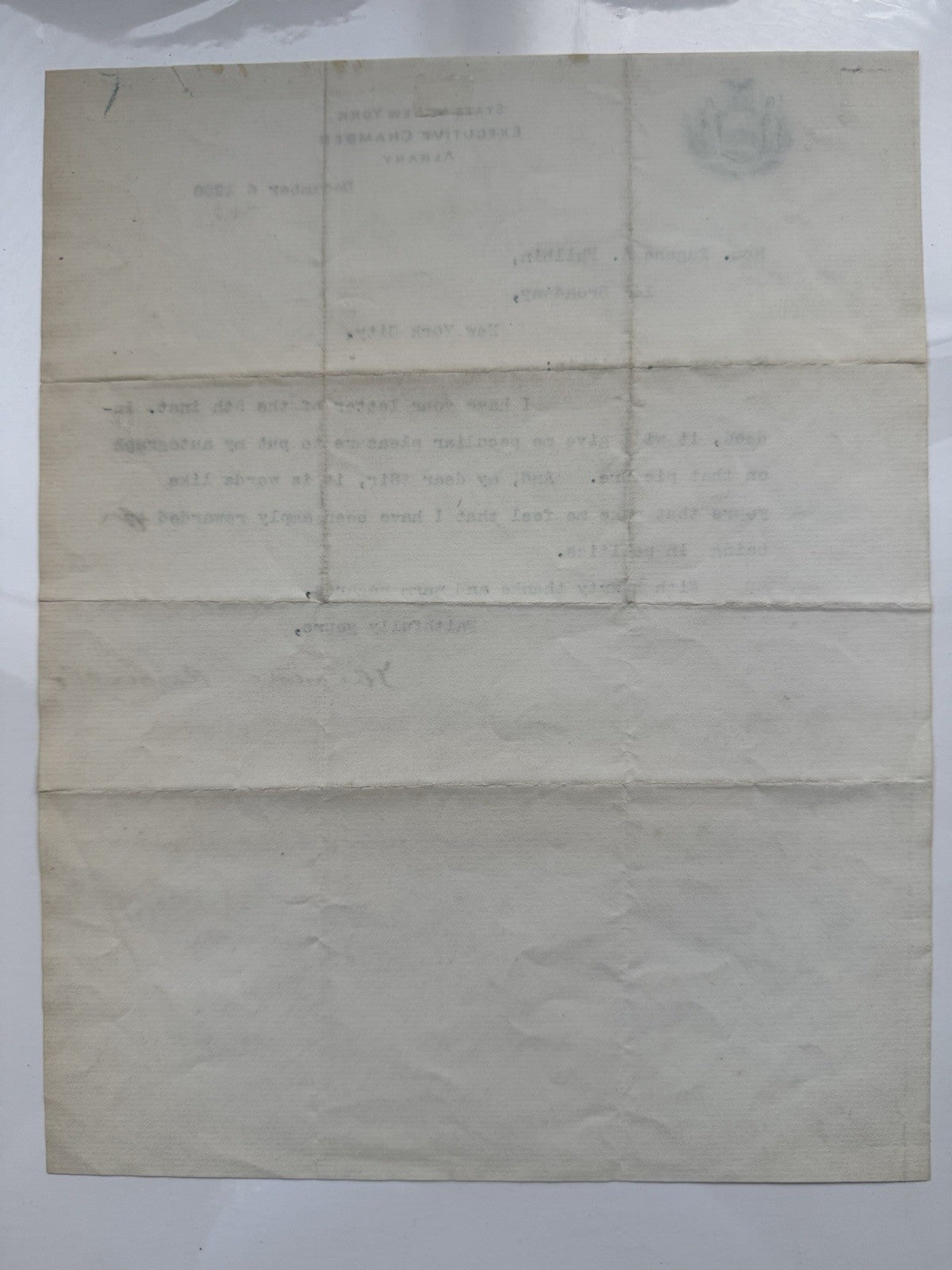 Written on official State of New York Executive Chamber stationery from Albany, the letter is addressed to Hon. Eugene A. Philbin, a prominent New York City lawyer and district attorney.