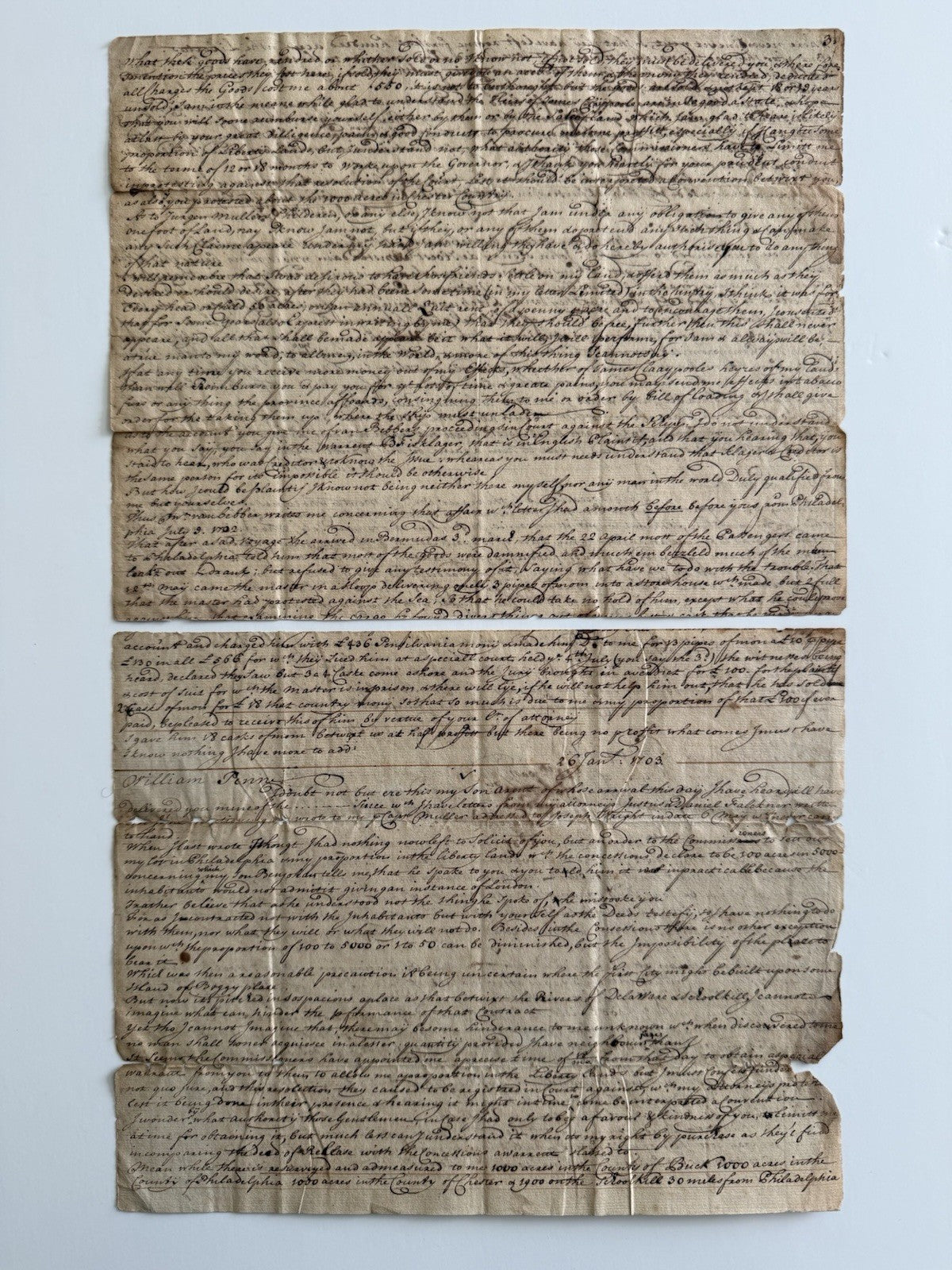 The manuscript is not written or signed by William Penn, but reflects direct contemporary reliance on his proprietary authority. Paleographic and contextual evidence indicate authorship by a Pennsylvania provincial clerk, likely associated with the Commissioners of Property or the Philadelphia County courts, and the document represents official or quasi-official recordkeeping rather than private correspondence.