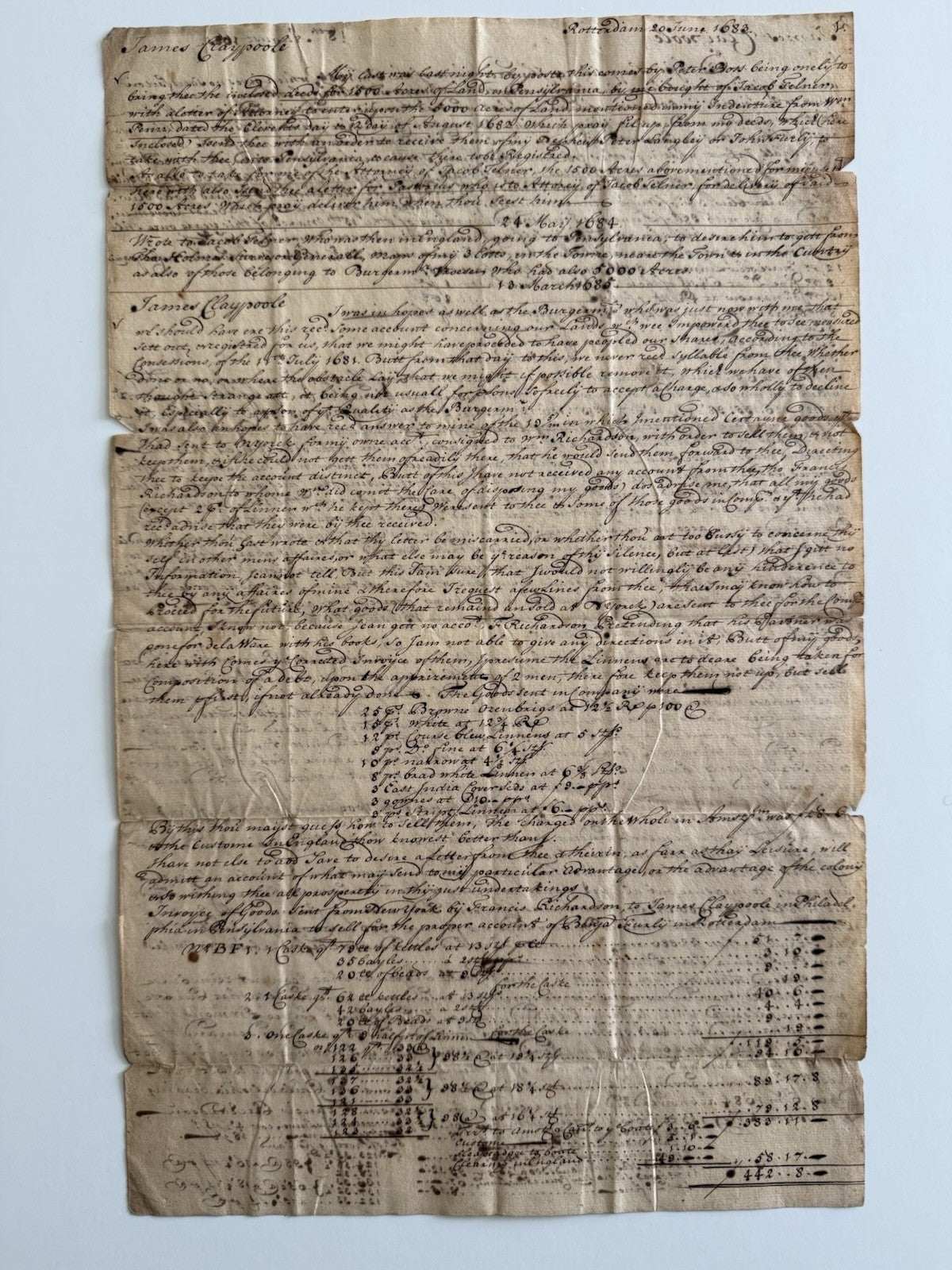 Colonial Era Manuscript Relating To William Penn, James Claypoole And Others