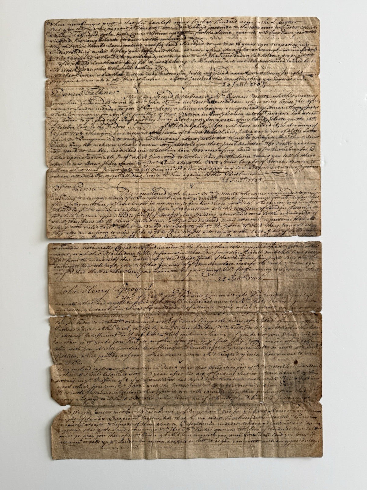 The document names several identifiable contemporaries of William Penn, including James Claypoole, prominent Quaker merchant and early Philadelphia settler; Daniel Falkner, Quaker minister and witness; and John Henry Sproges, a settler involved in land or financial proceedings. Dated passages within the text establish composition in January 1703, during Penn’s second period of control over the colony.