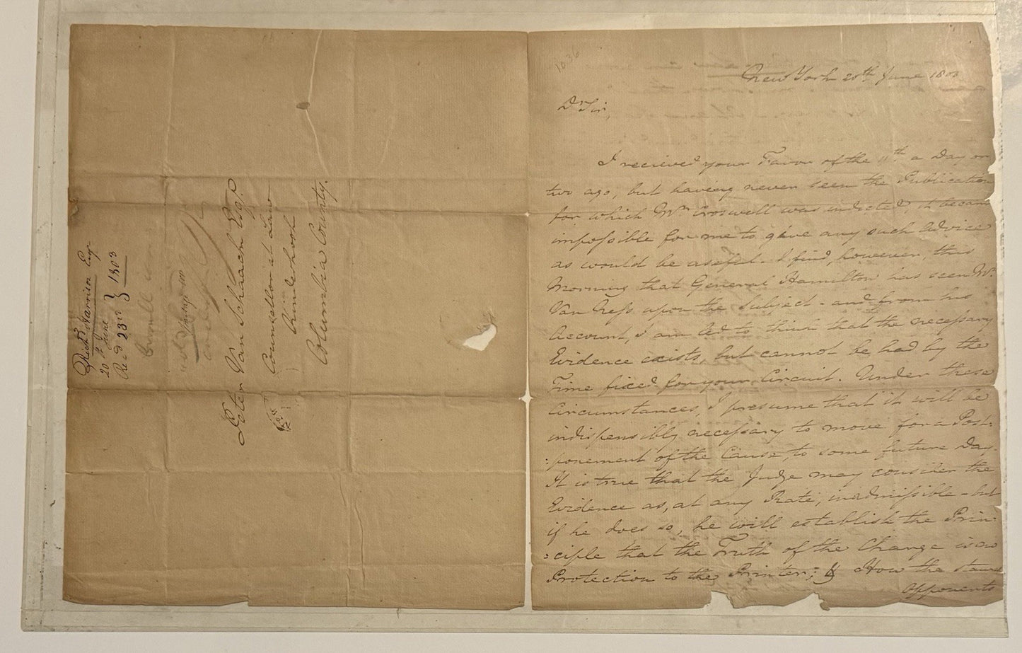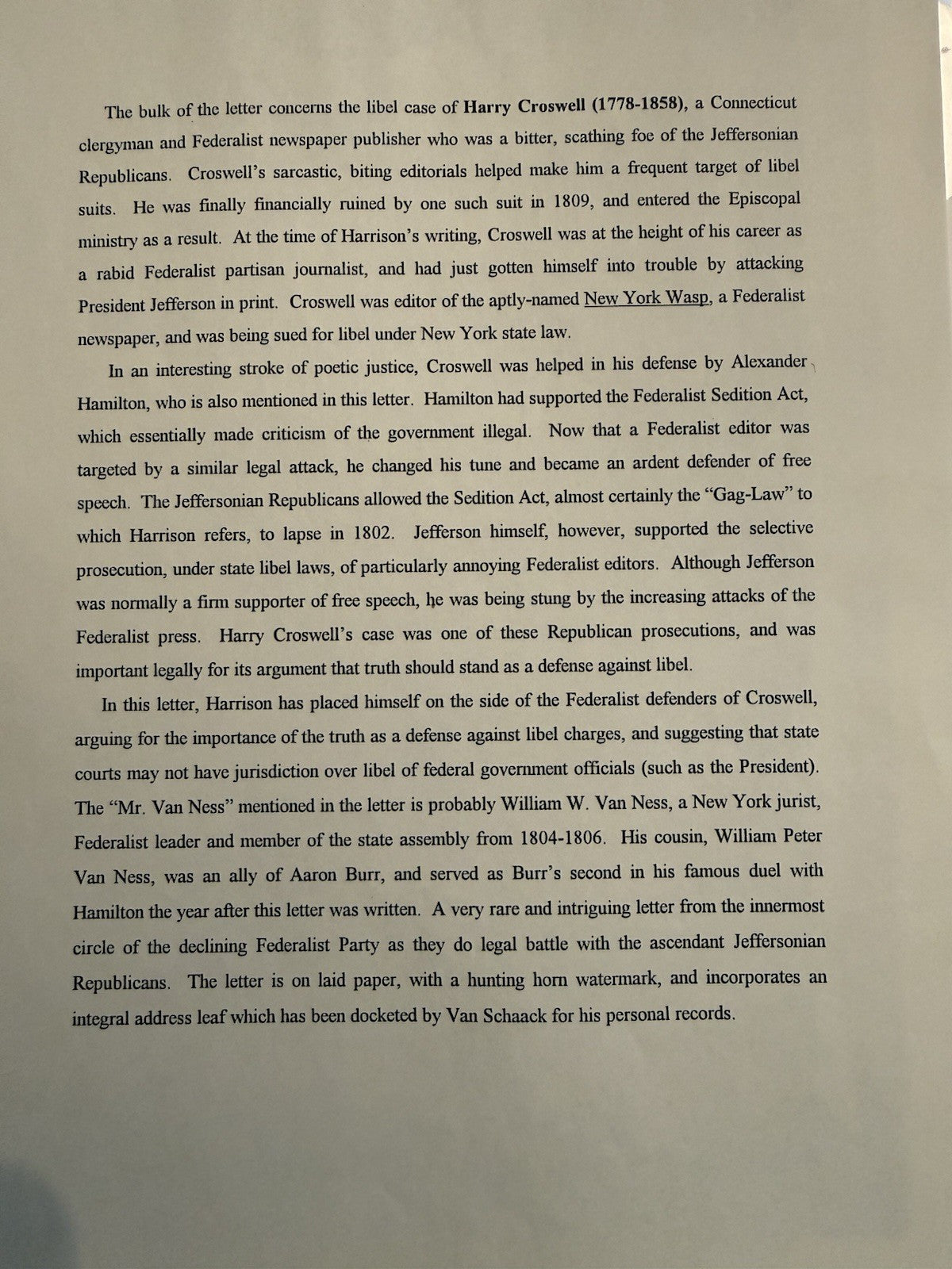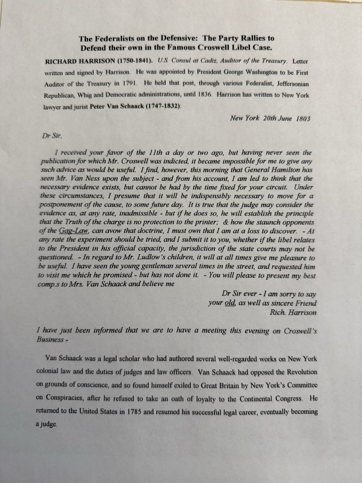 Signed Letter June 20, 1803 Mentioning Alexander Hamilton And People Vs Croswell