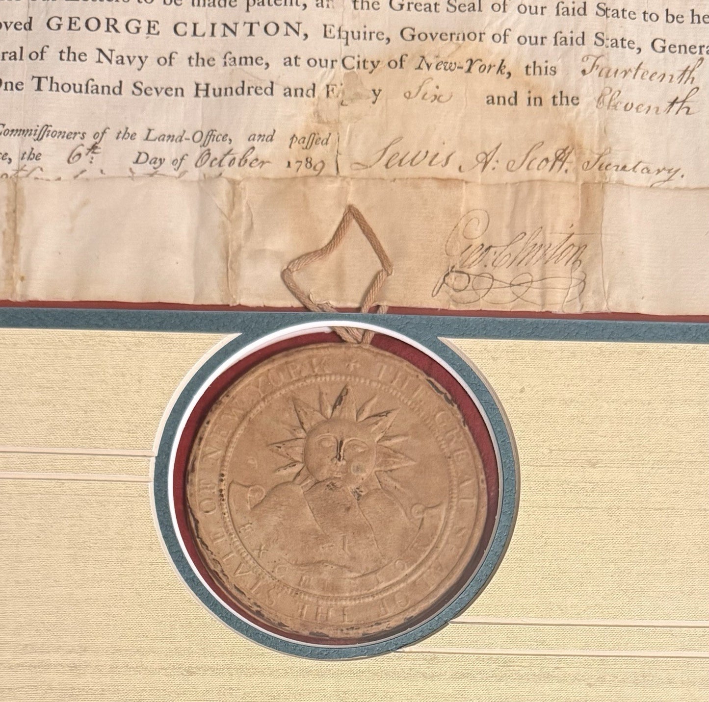 * Signatures: The document was signed by George Clinton, Esquire, Governor of the State of New-York. It was approved by the Commissioners of the Land-Office and passed the Secretary's Office on October 6, 1789.