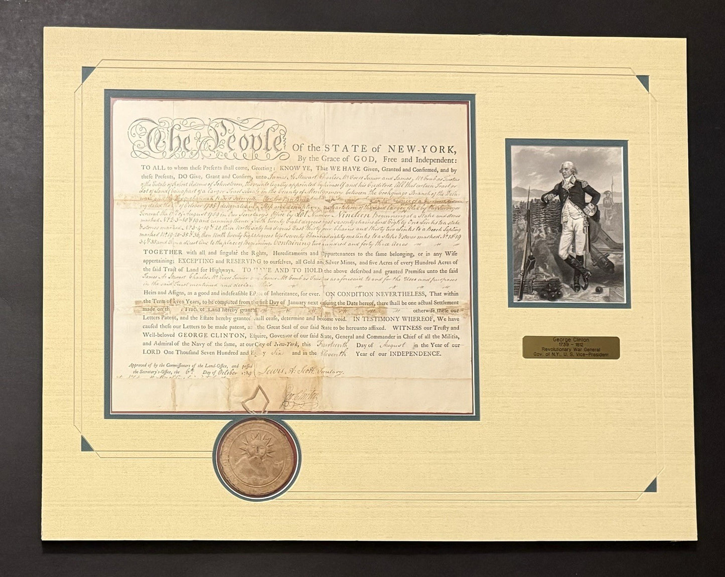 This matted 16 x 14 document with intact seal is a land patent issued by the State of New-York on August 14, 1789, a formal declaration granting a specific tract of land to named individuals.
