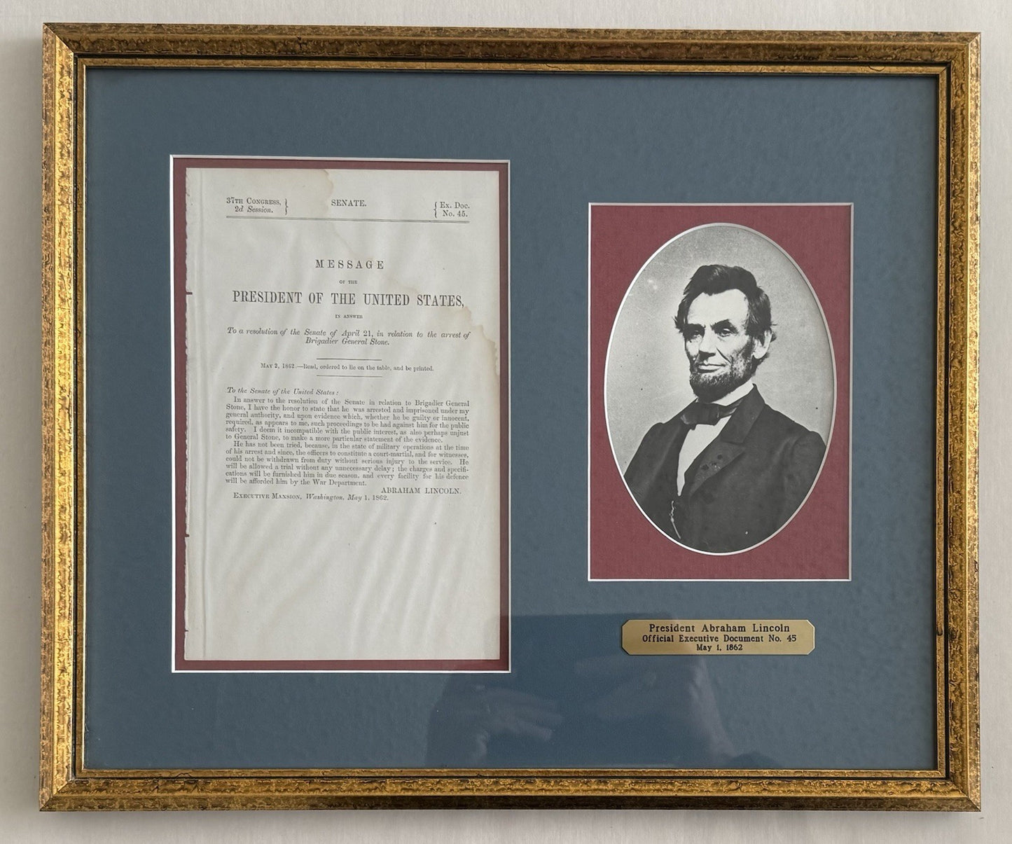 This framed display features a historical U.S. Senate document from May 1, 1862, concerning the controversial arrest of Brigadier General Stone, along with a portrait of President Abraham Lincoln.