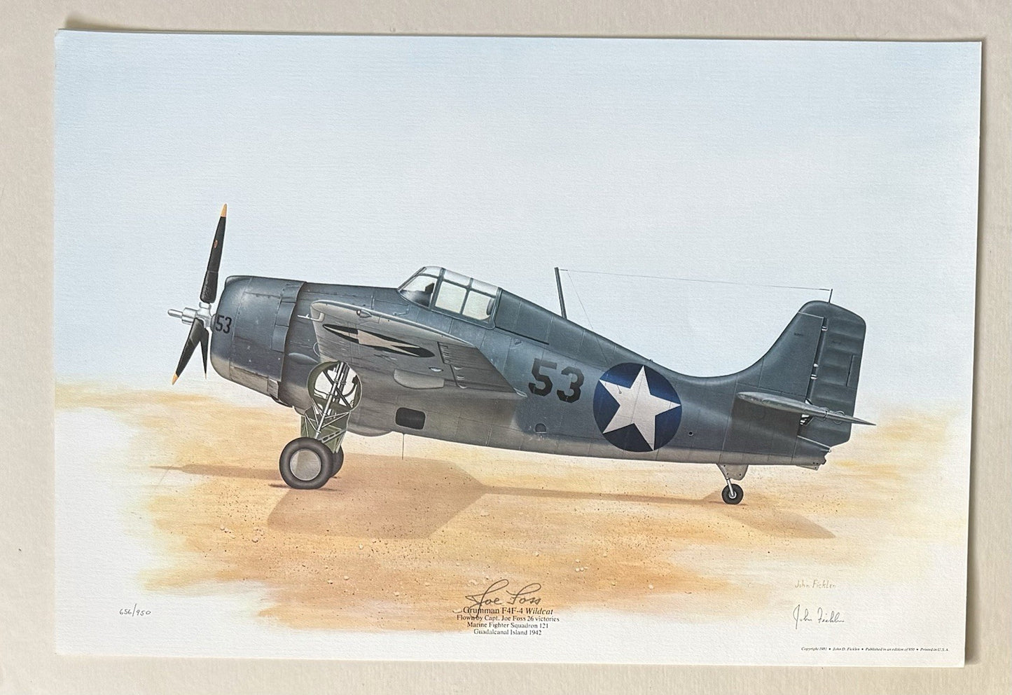This image is a limited edition art print of a Grumman F4F-4 Wildcat, signed by both the artist and the legendary pilot who flew the depicted aircraft.